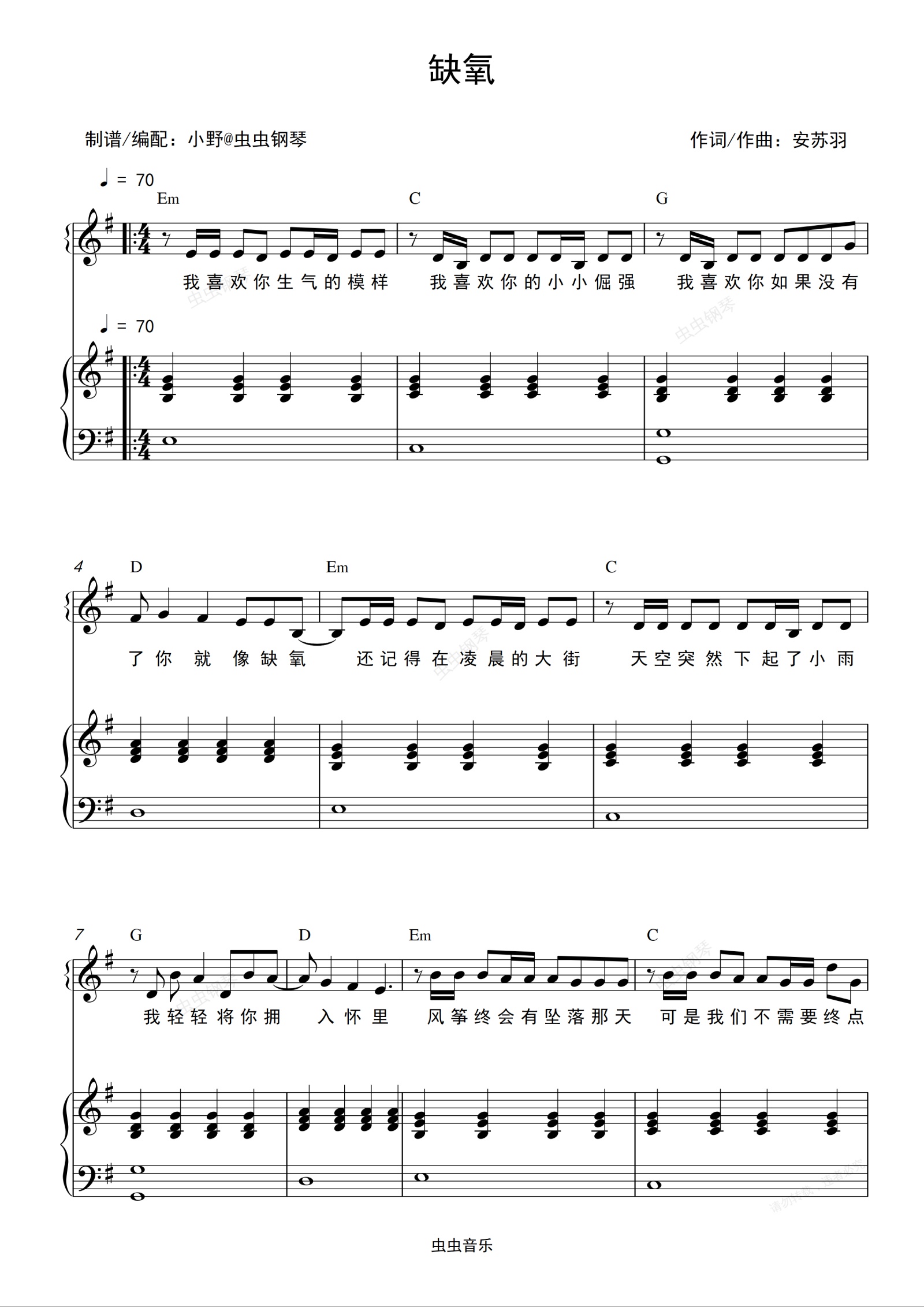 钢琴谱:缺氧(和弦弹唱版)