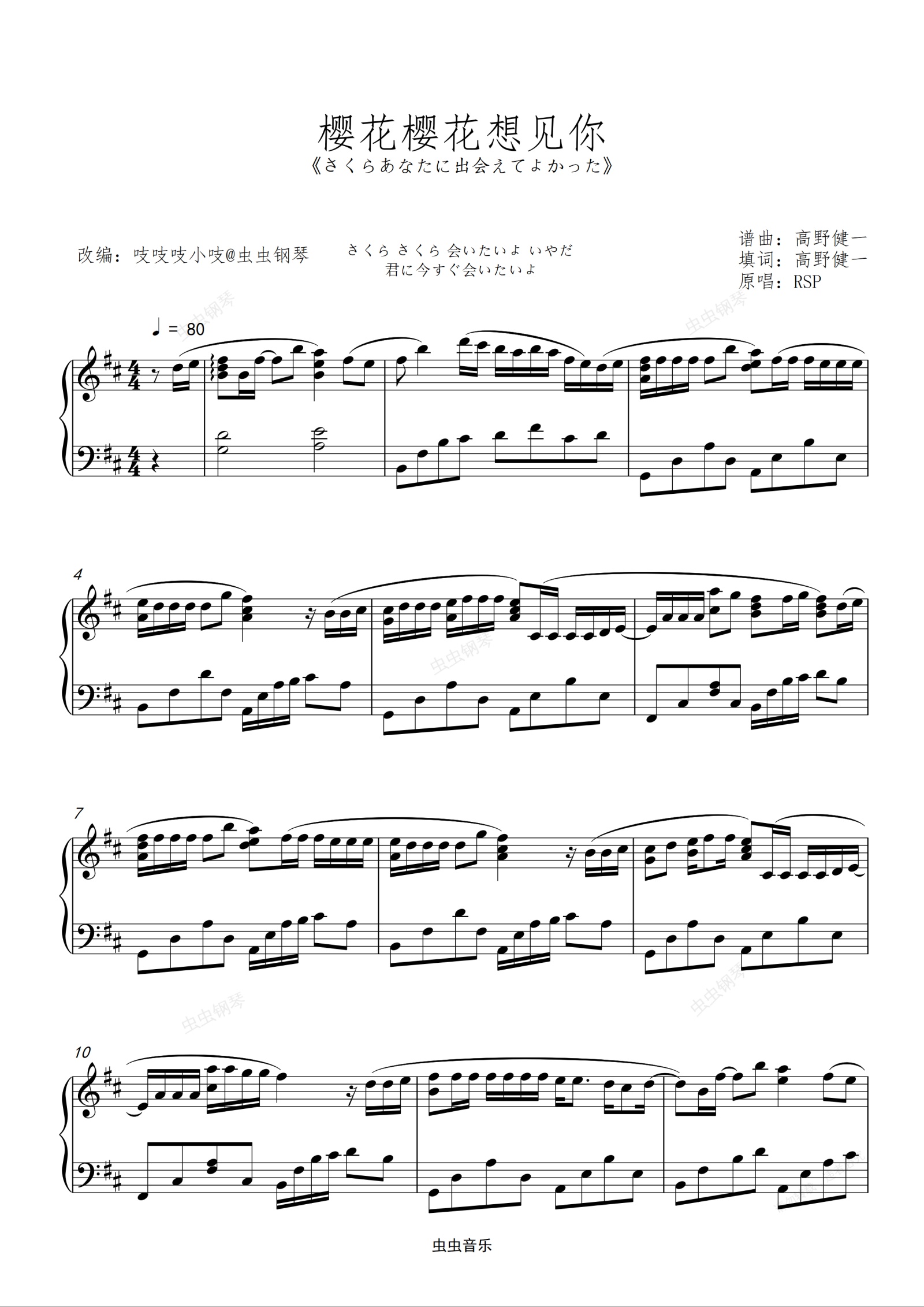 钢琴谱:樱花樱花,想见你-D-高野健一 【中级难度】原调 吱吱编配