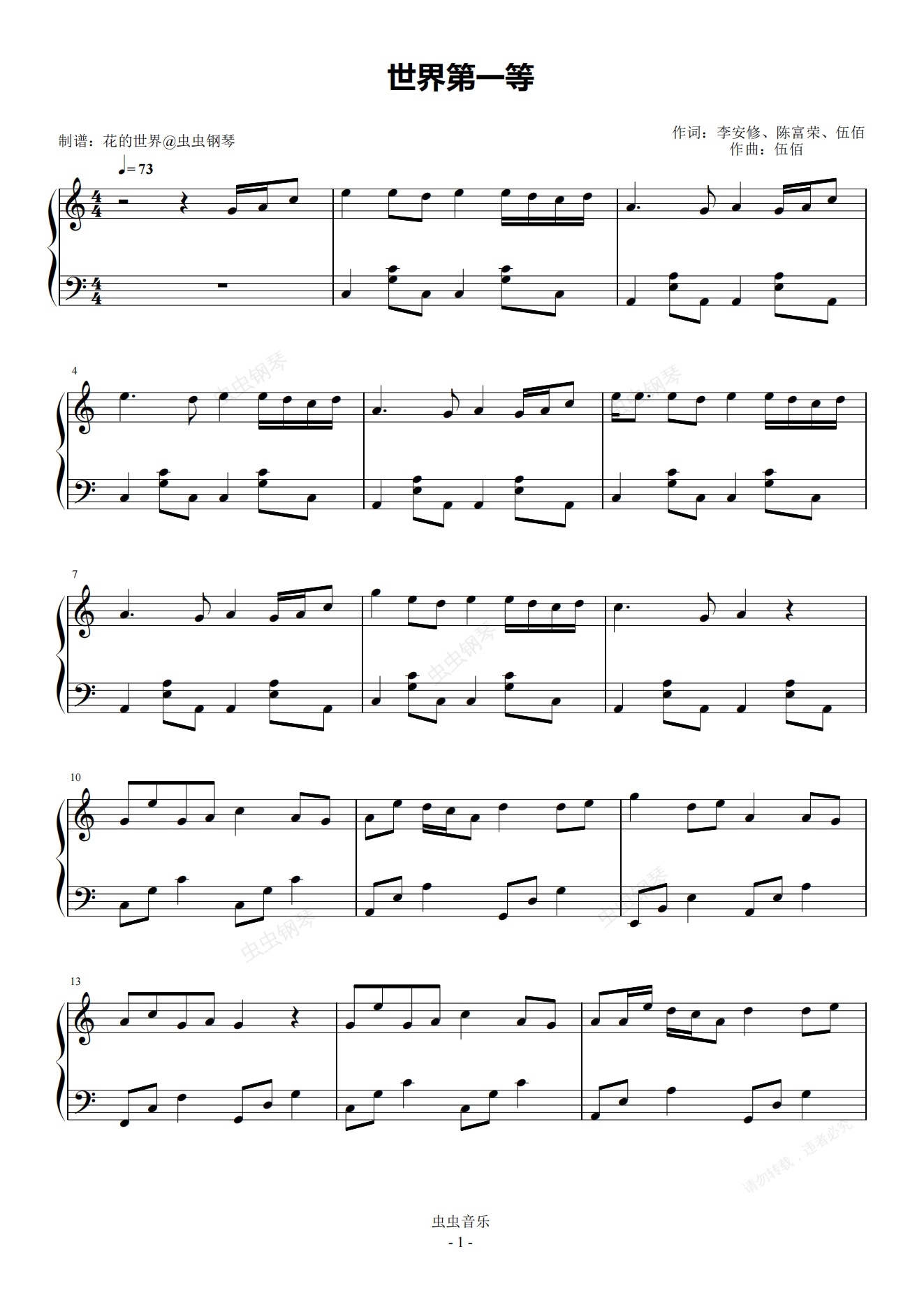 钢琴谱:世界第一等 C调简易版 伍佰/刘德华