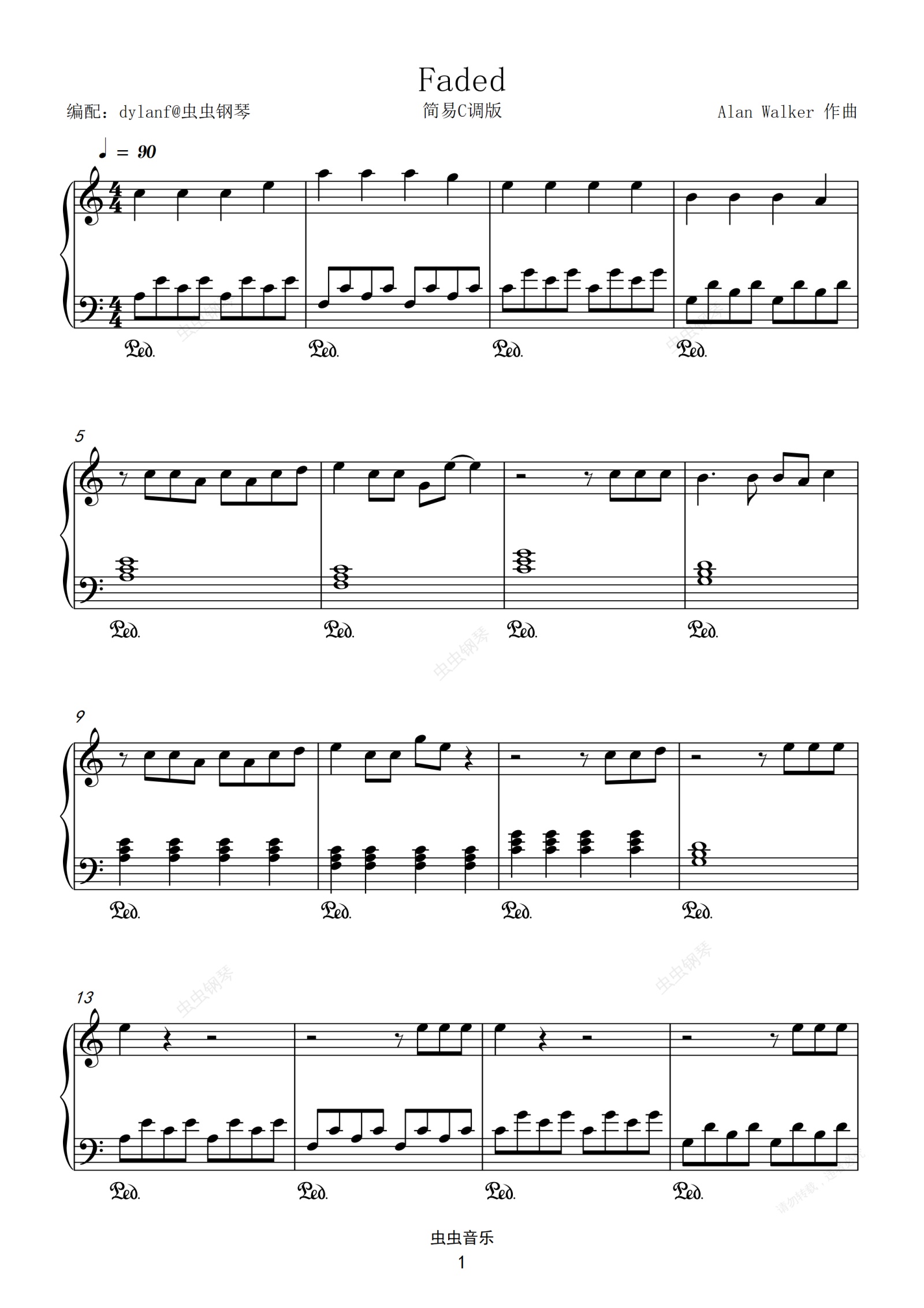 钢琴谱:Faded电音C调好听好弹版Alan Walker