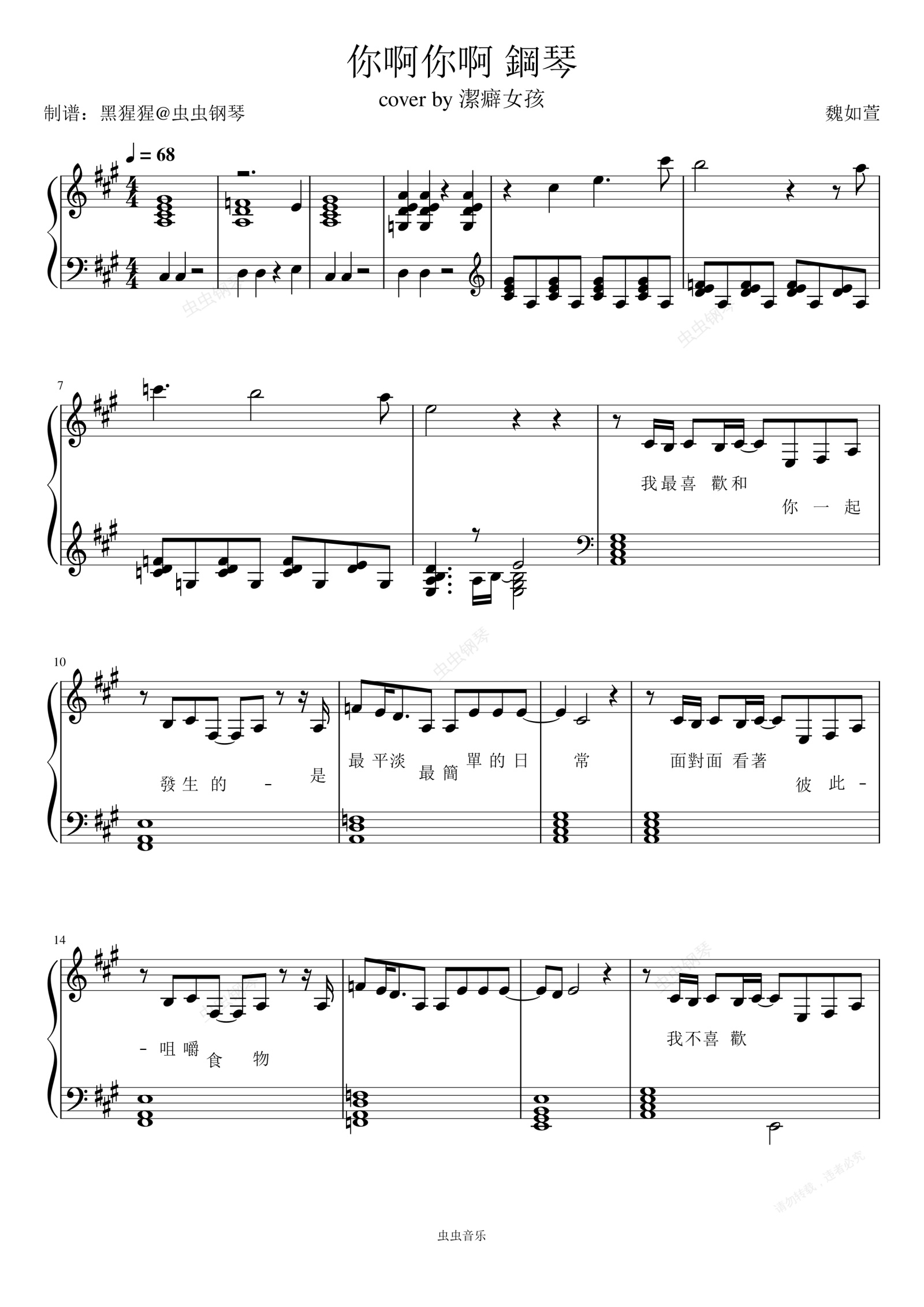 钢琴谱:魏如萱-A调 《你啊你啊》