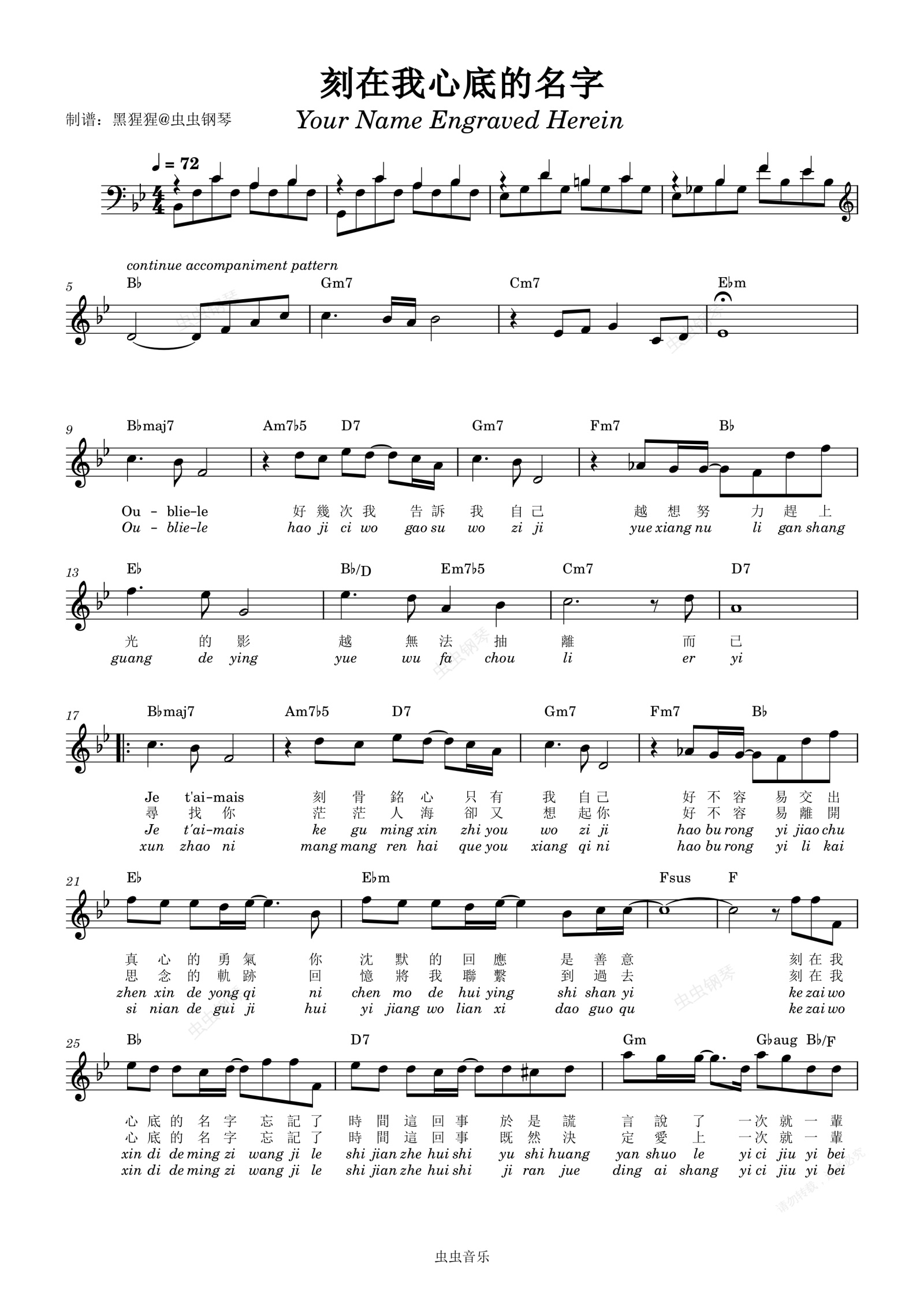钢琴谱:卢广仲-Bb调 《刻在我心底的名字》