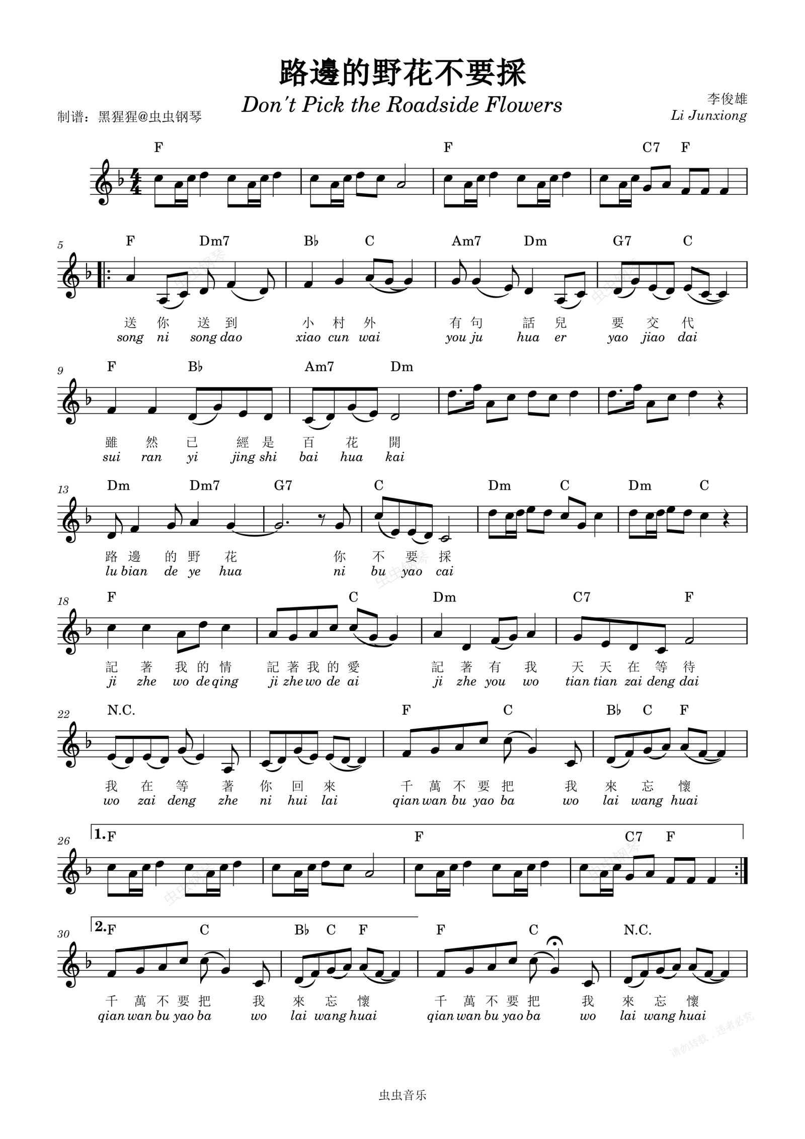 钢琴谱:邓丽君-F调 《路边的野花不要采》