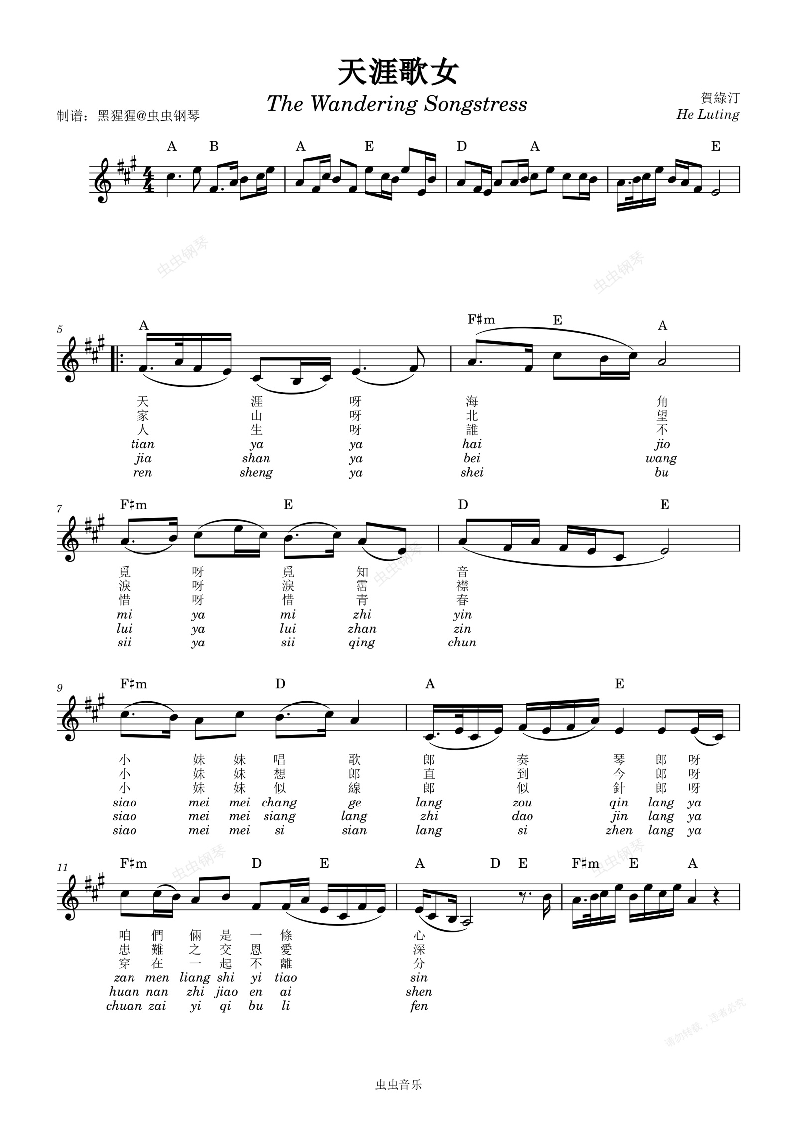 钢琴谱:周璇-A调 《天涯歌女》