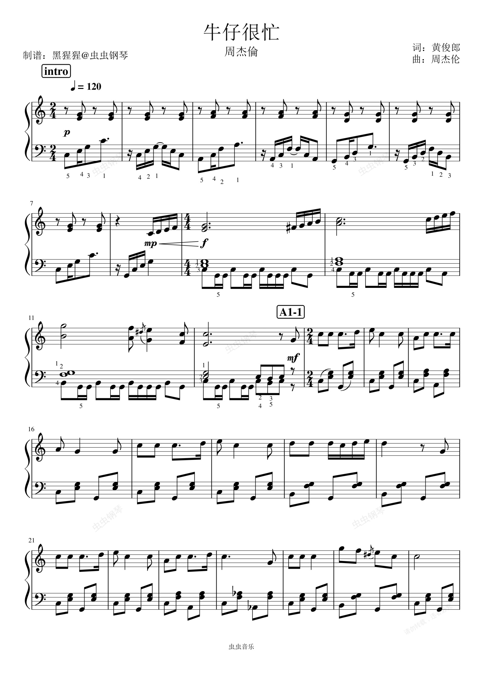 钢琴谱:周杰伦-C调 《牛仔很忙》