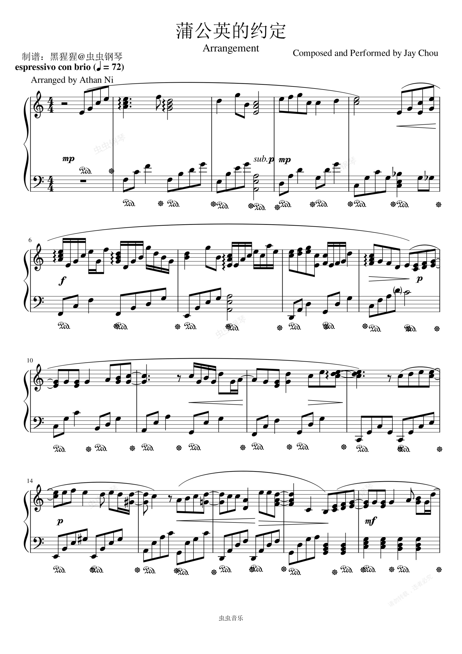 钢琴谱:周杰伦-C调 《蒲公英的约定钢琴改编》