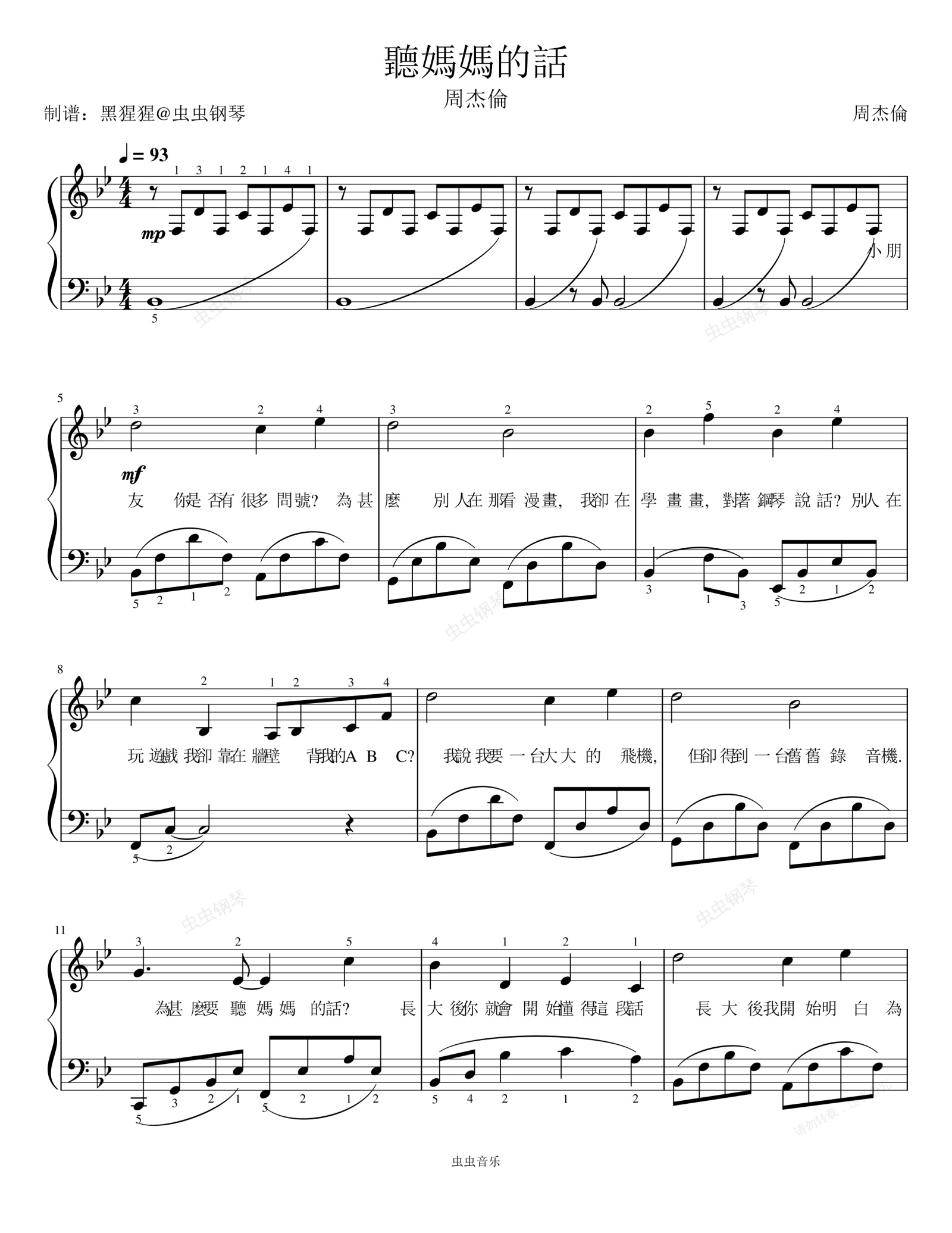 钢琴谱:周杰伦-Bb调 《听妈妈的话》