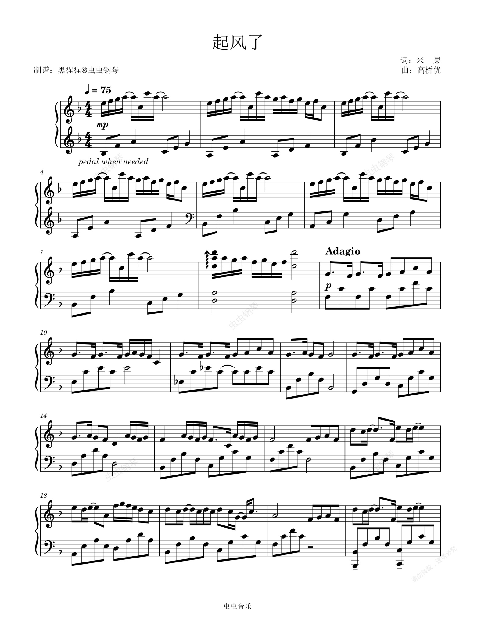 钢琴谱:吴青峰-F调 《起风了》