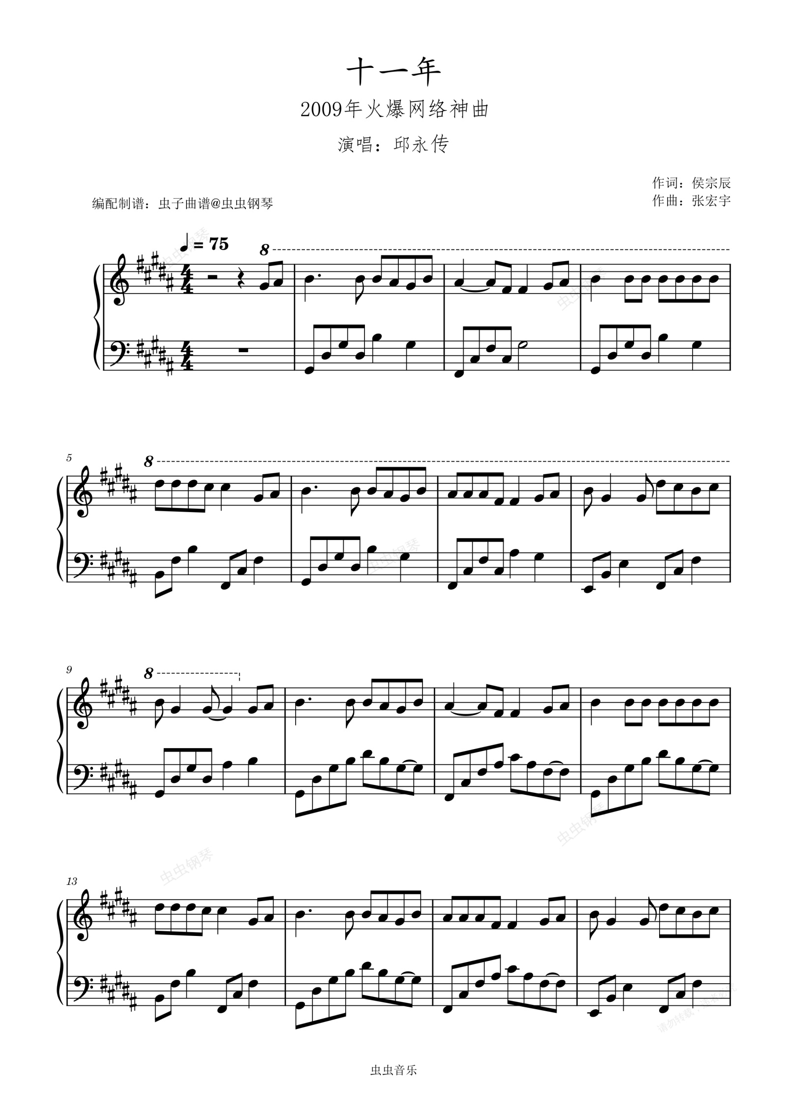 钢琴谱:十一年(邱永传)2009年风靡网络神曲-B大调编配