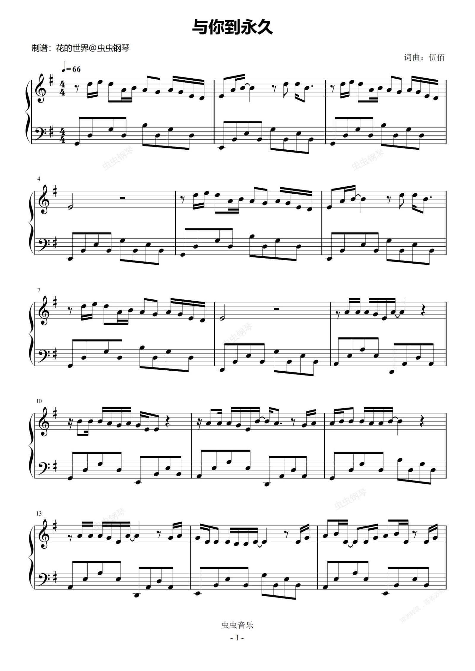 钢琴谱:与你到永久 原调简易版 伍佰