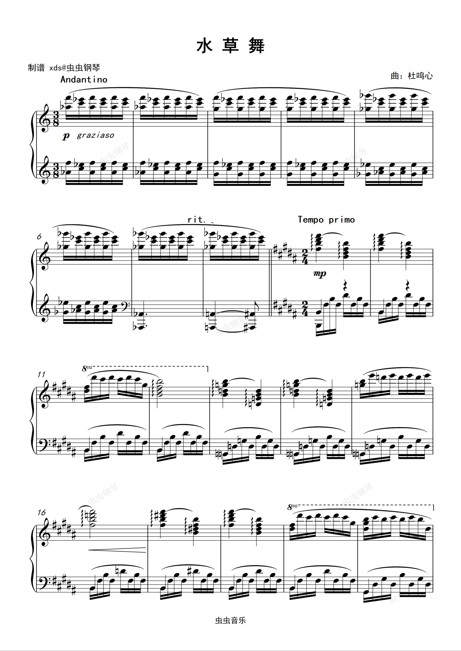 主旋律基本只有4小节,全曲不断递进又不断重复的模式,营造了“水草”飘逸摇曳的游离形象;前奏描绘“水草”飘摇流动之声,只是简单的F与降E两个音的反复重复与模进。清澈的琶音仿佛置身于波光粼粼的碧水之中,眼前就是曼波中轻柔舞动的海草,就像雨后掠过的一丝清风、晨曦的微露、悦耳动听,旋律音调具有神话般的仙境……