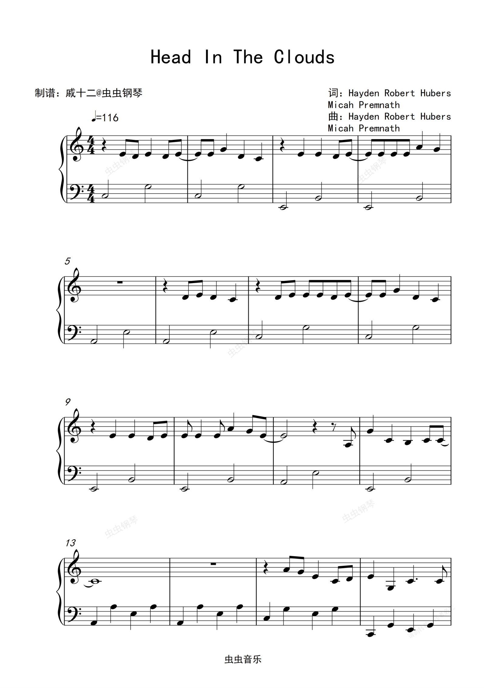 钢琴谱:Head in the Clouds-C调简单版
