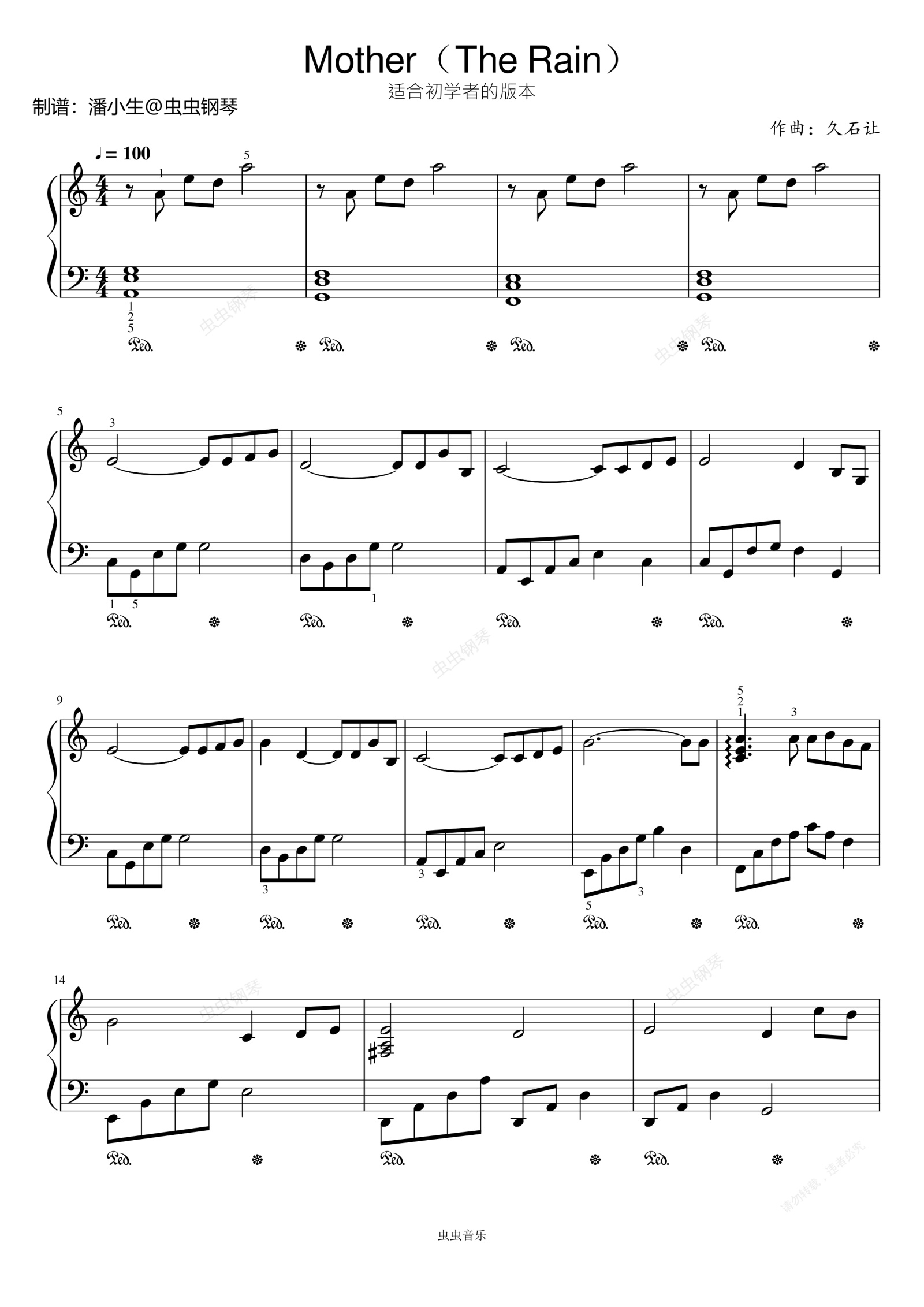 钢琴谱:《The rain》(Mother)初学者优选,C大调简单版,独奏谱,久石让