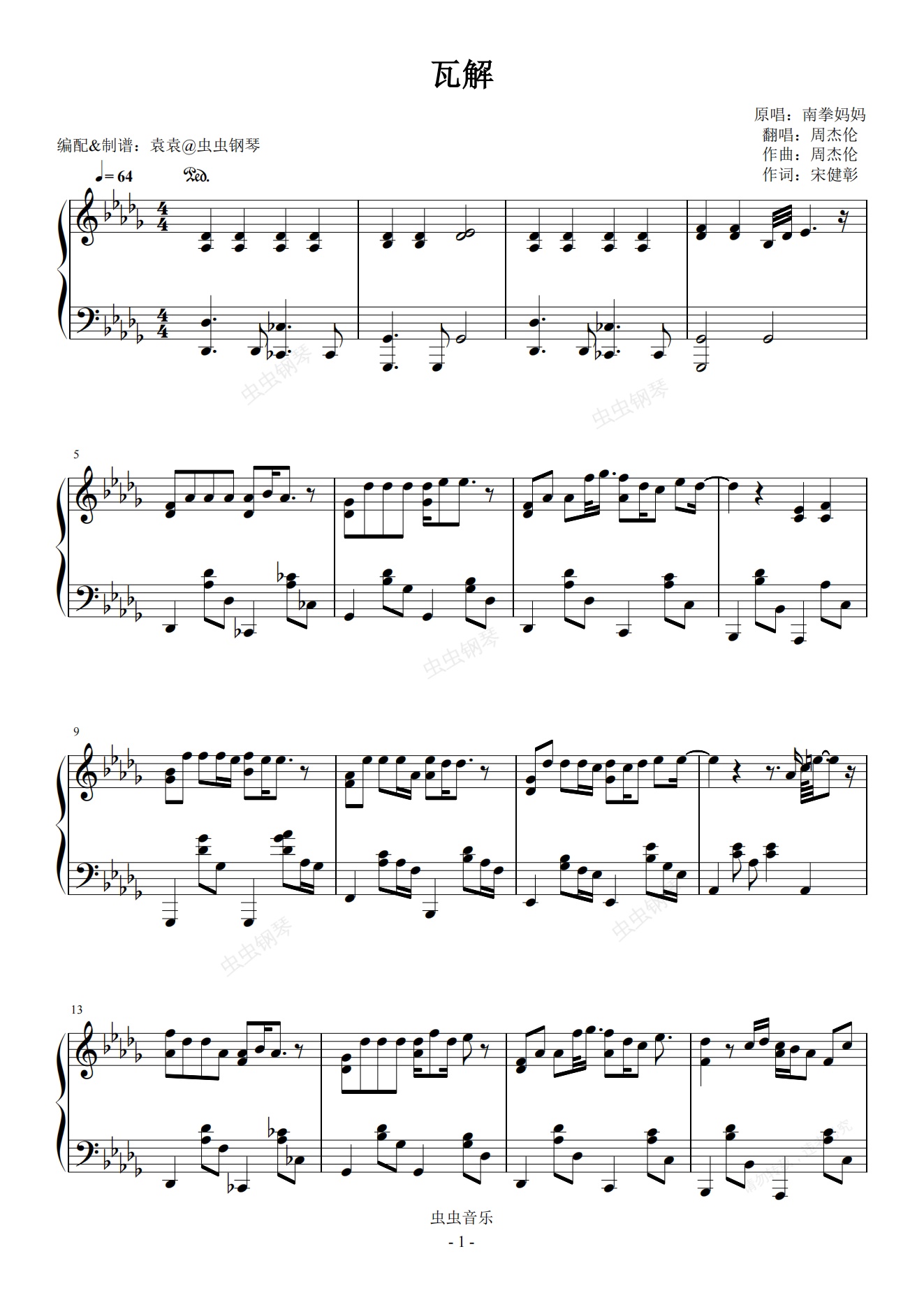 钢琴谱:瓦解 周杰伦版 原调 抒情演奏版