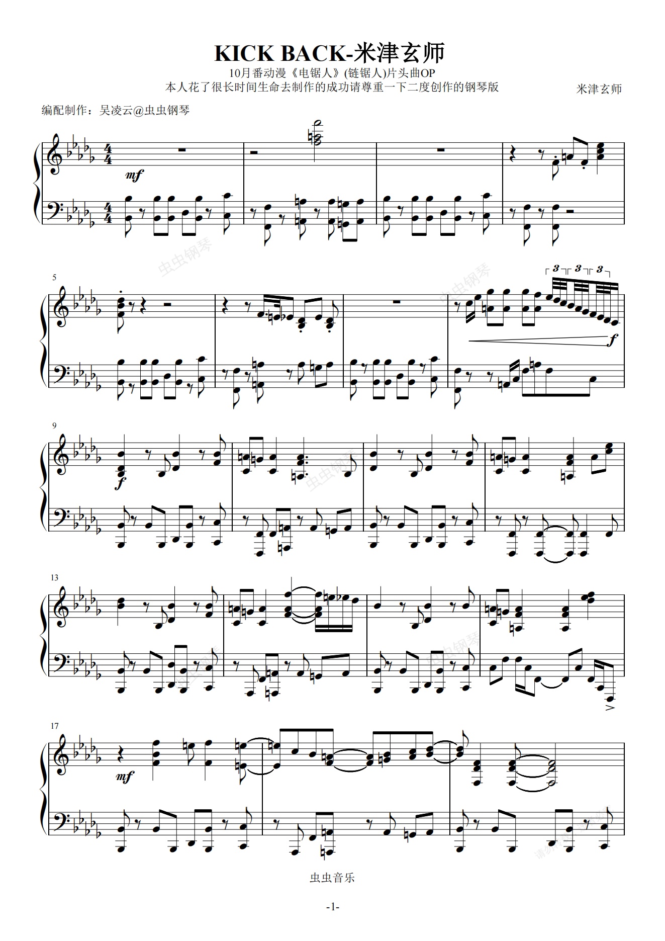 钢琴谱:KICK BACK-米津玄师 10月番动漫《电锯人》(链锯人)片头曲OP 吴凌云钢琴演奏版