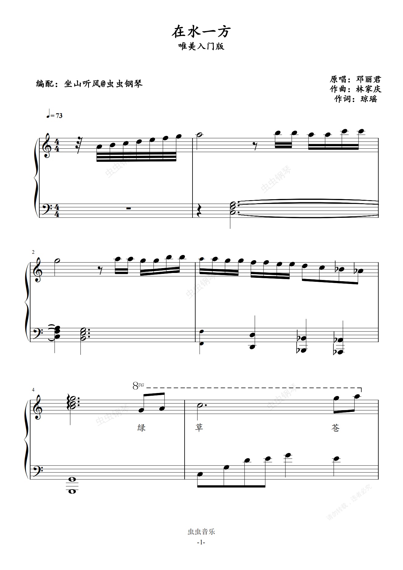 钢琴谱:在水一方——唯美入门版【邓丽君】