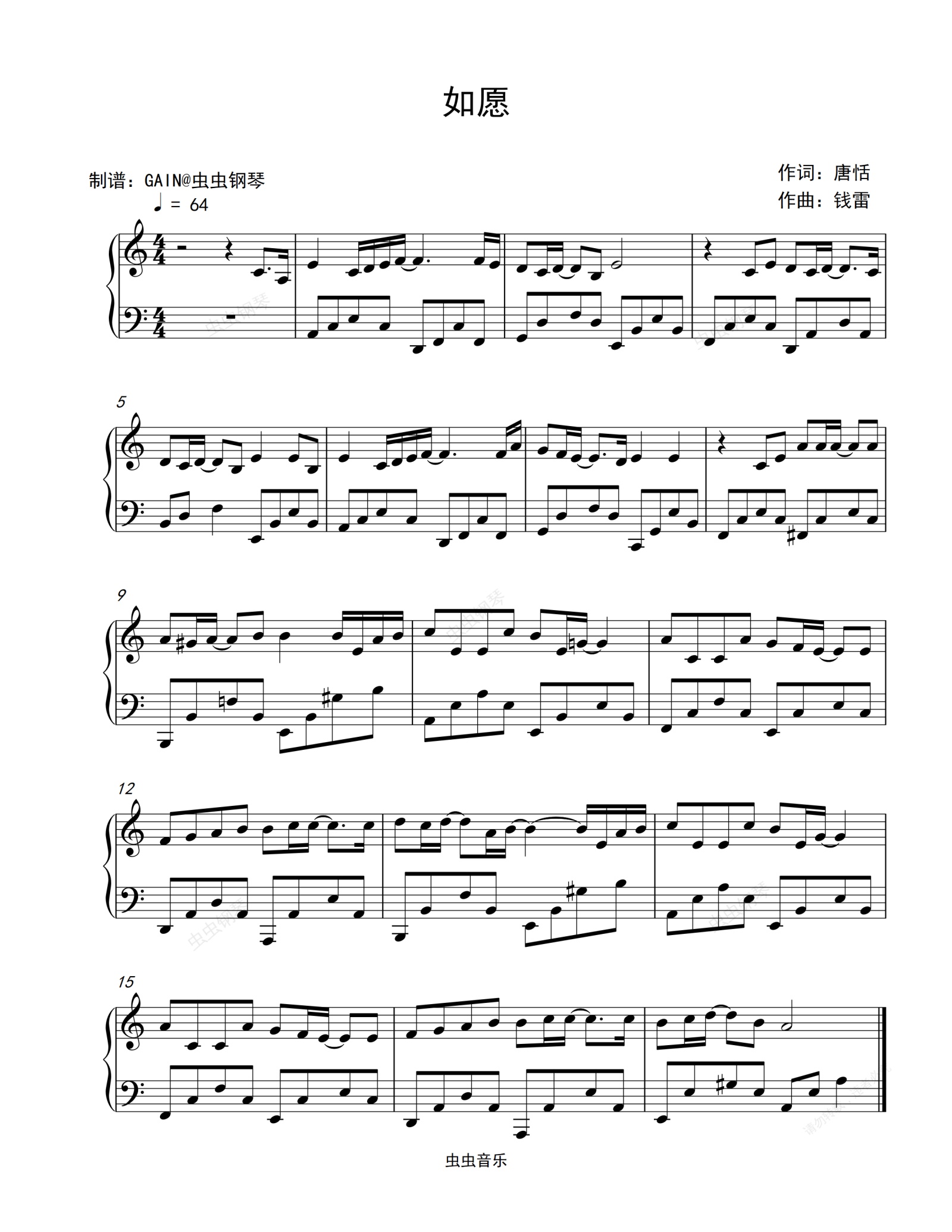 钢琴谱:如愿-王菲-c调简单版-我和我的父辈主题推广曲