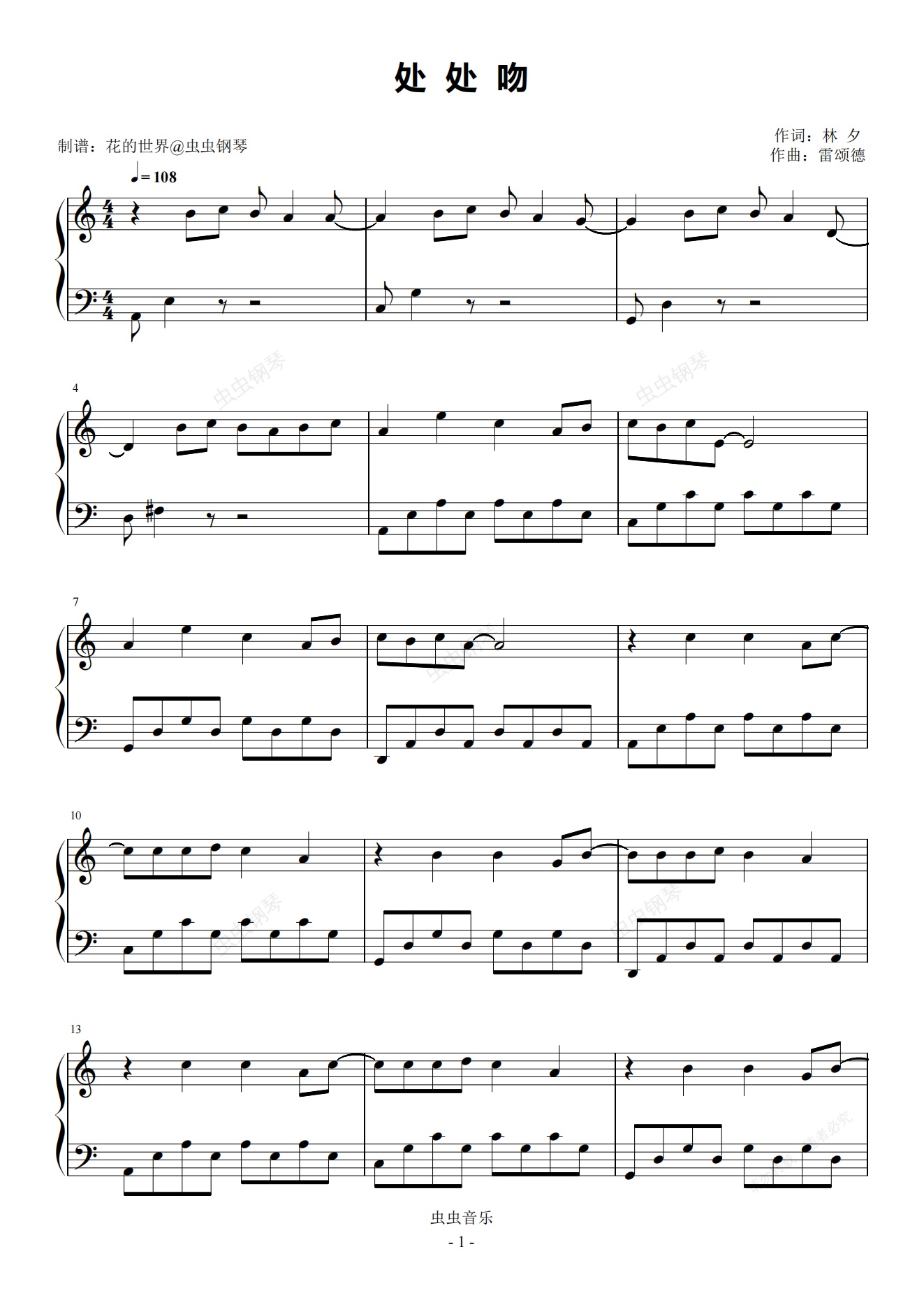 钢琴谱:处处吻 C调简易版  杨千嬅
