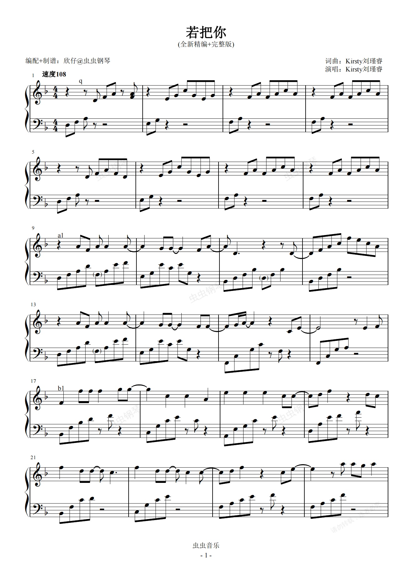 钢琴谱:Kirsty刘瑾睿-F《若把你》(全新精编+完整版)