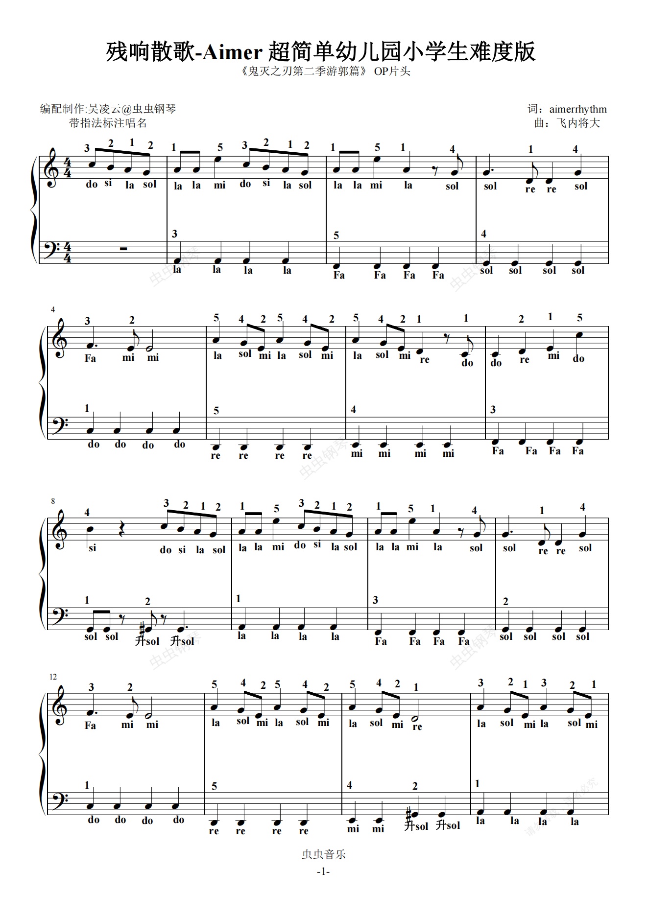 钢琴谱:残响散歌(残響散歌)-Aimer 超简单幼儿园小学生难度版 带指法标注唱名 《鬼灭之刃第二季游郭篇》 OP片头