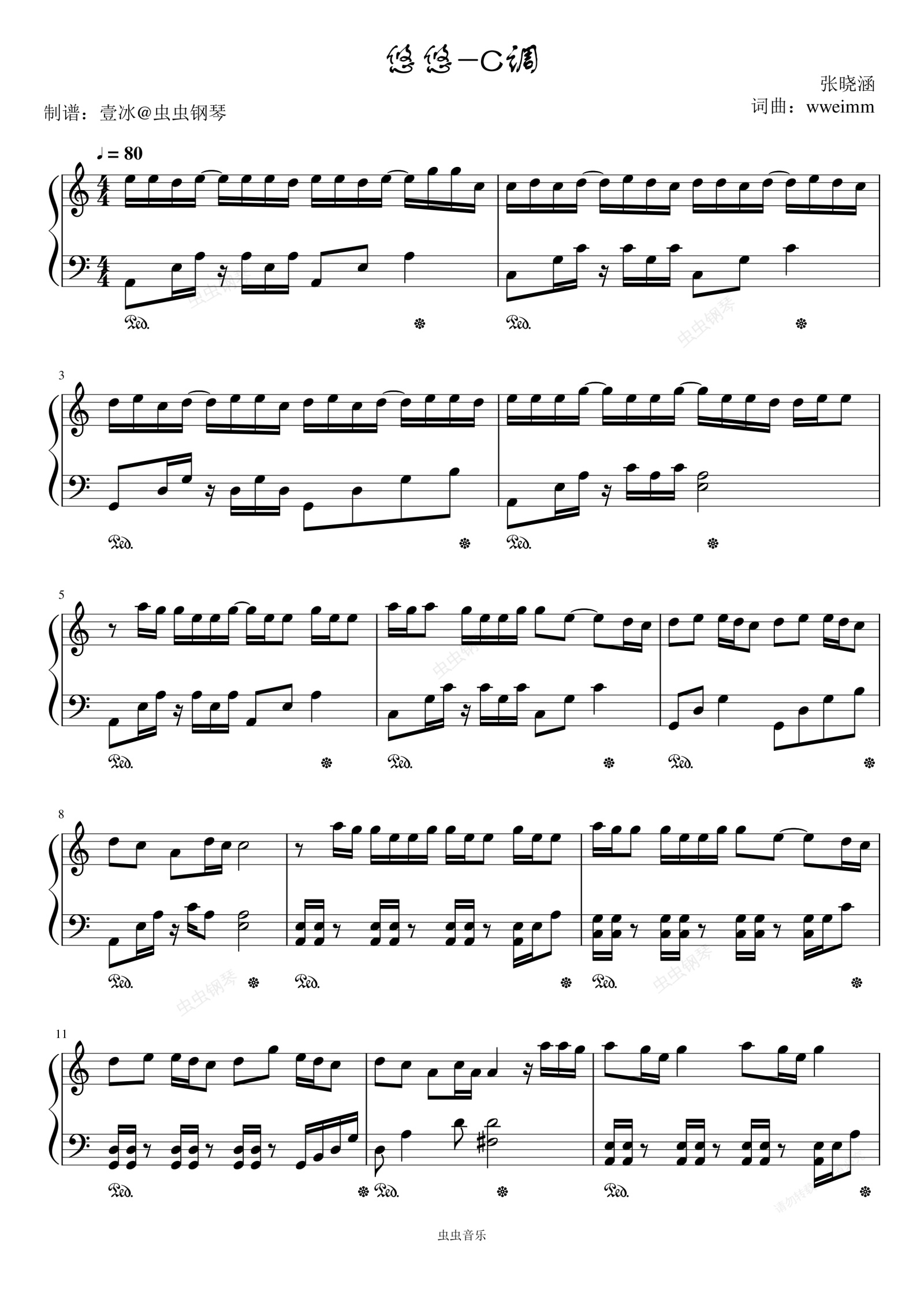 钢琴谱:悠悠//张晓涵-C调版 简单易上手