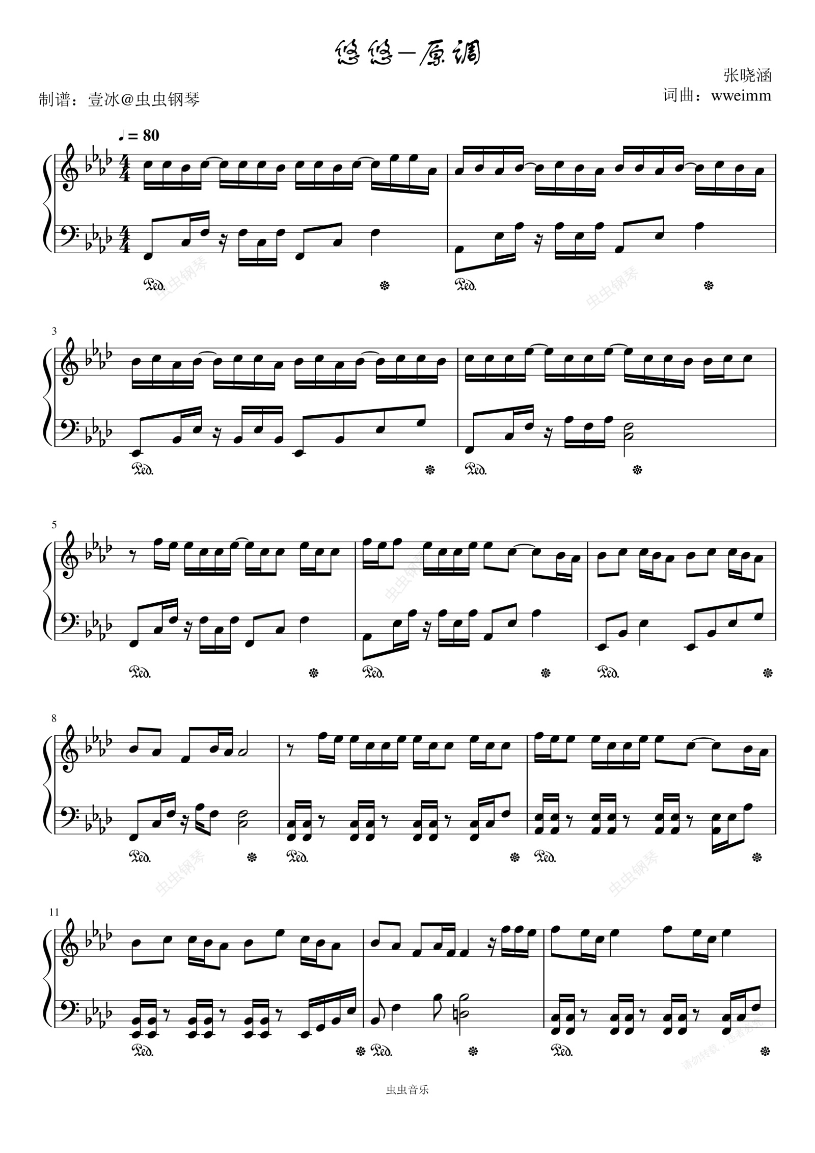 钢琴谱:悠悠//张晓涵-原调版 简单易上手