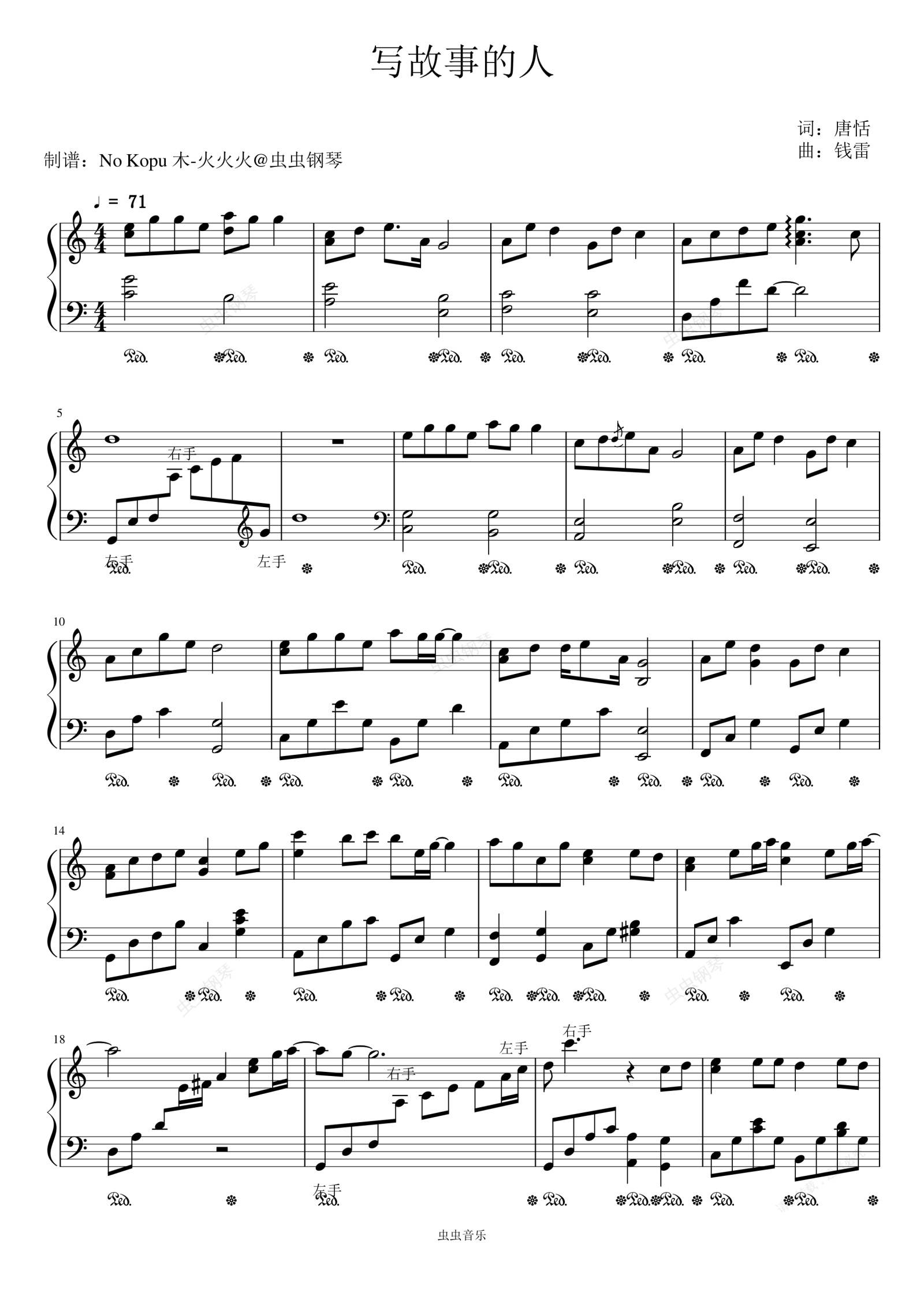 钢琴谱:精编《写故事的人》C调(《我们这十年》主题曲)-雷佳