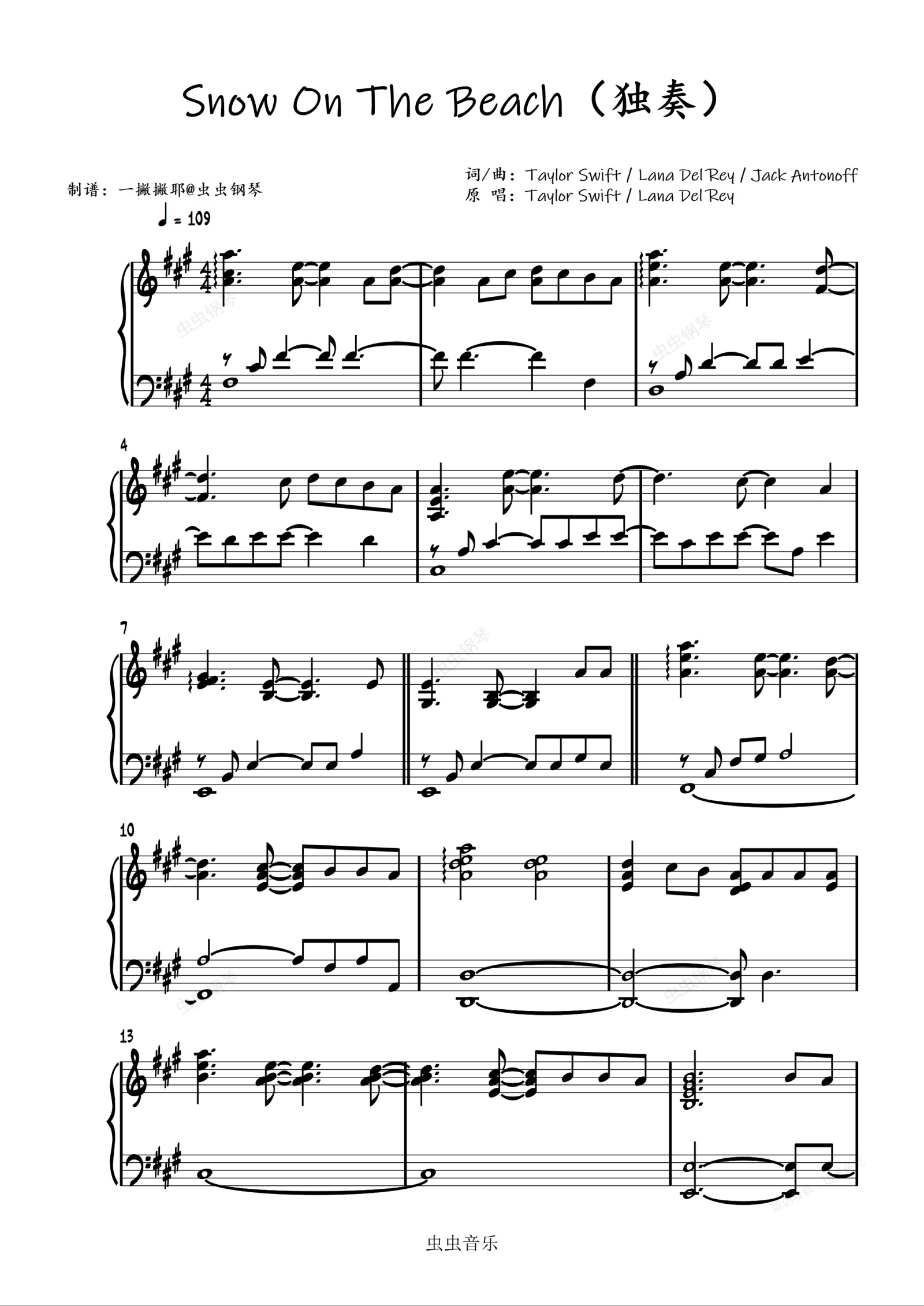 钢琴谱:完美独奏《Snow On The Beach》Taylor Swift / Lana Del Rey|Midnights「一撇撇耶」