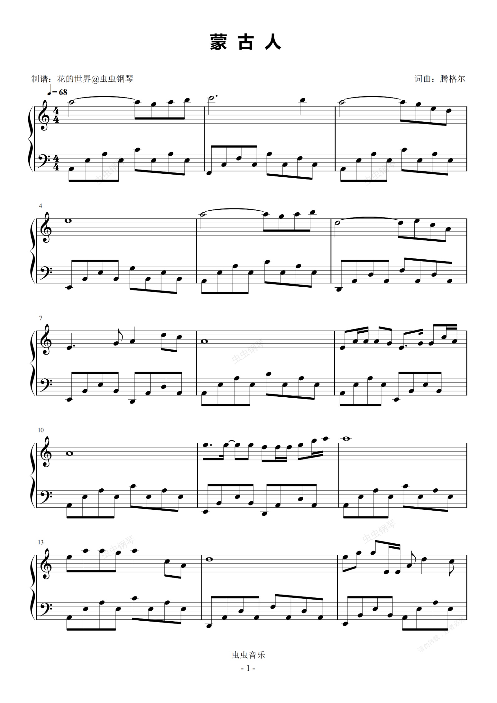 钢琴谱:蒙古人 C调简易 腾格尔 流行经典