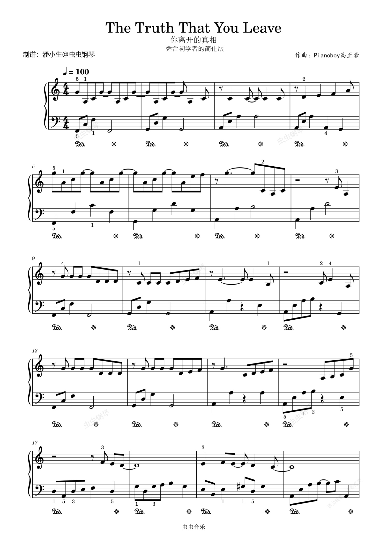 钢琴谱:《The truth that you leave》你离开的真相,C大调初学者简易版,带指法踏板,独奏谱