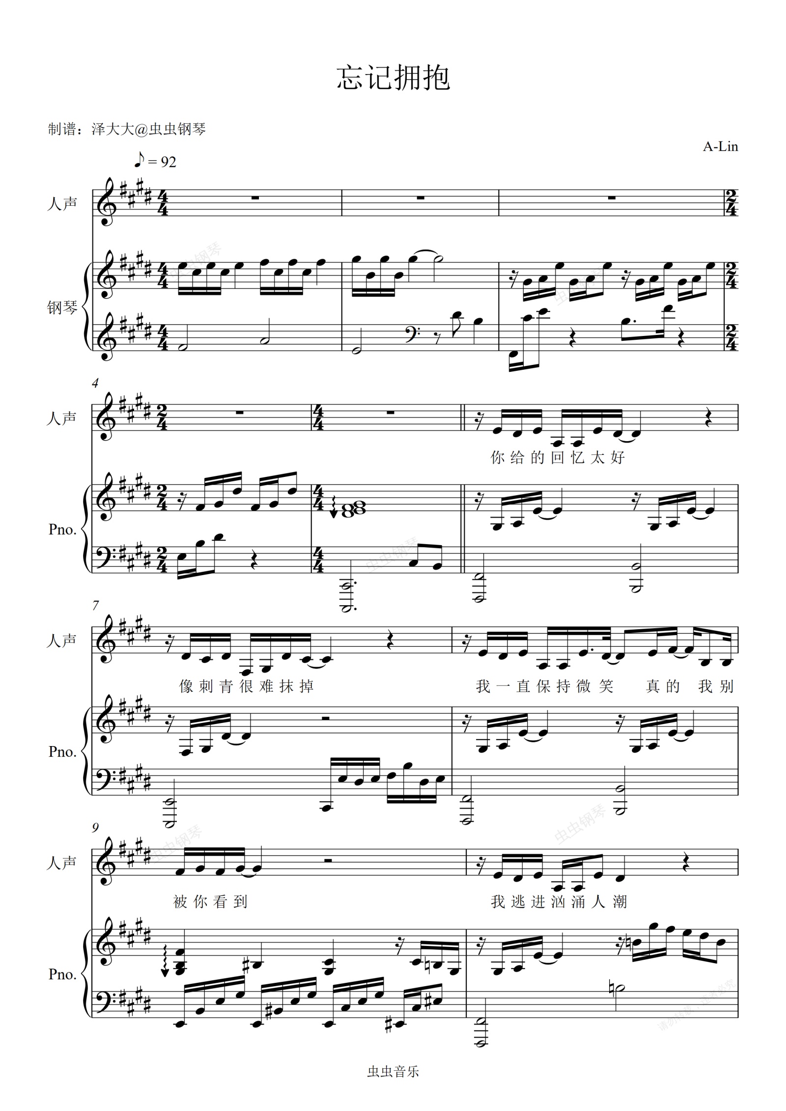 钢琴谱:忘记拥抱【精编弹唱附词】泽大大 A-Lin