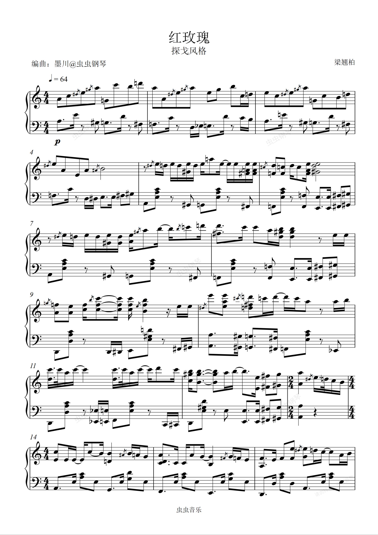 钢琴谱:红玫瑰—陈奕迅—tango曲风
