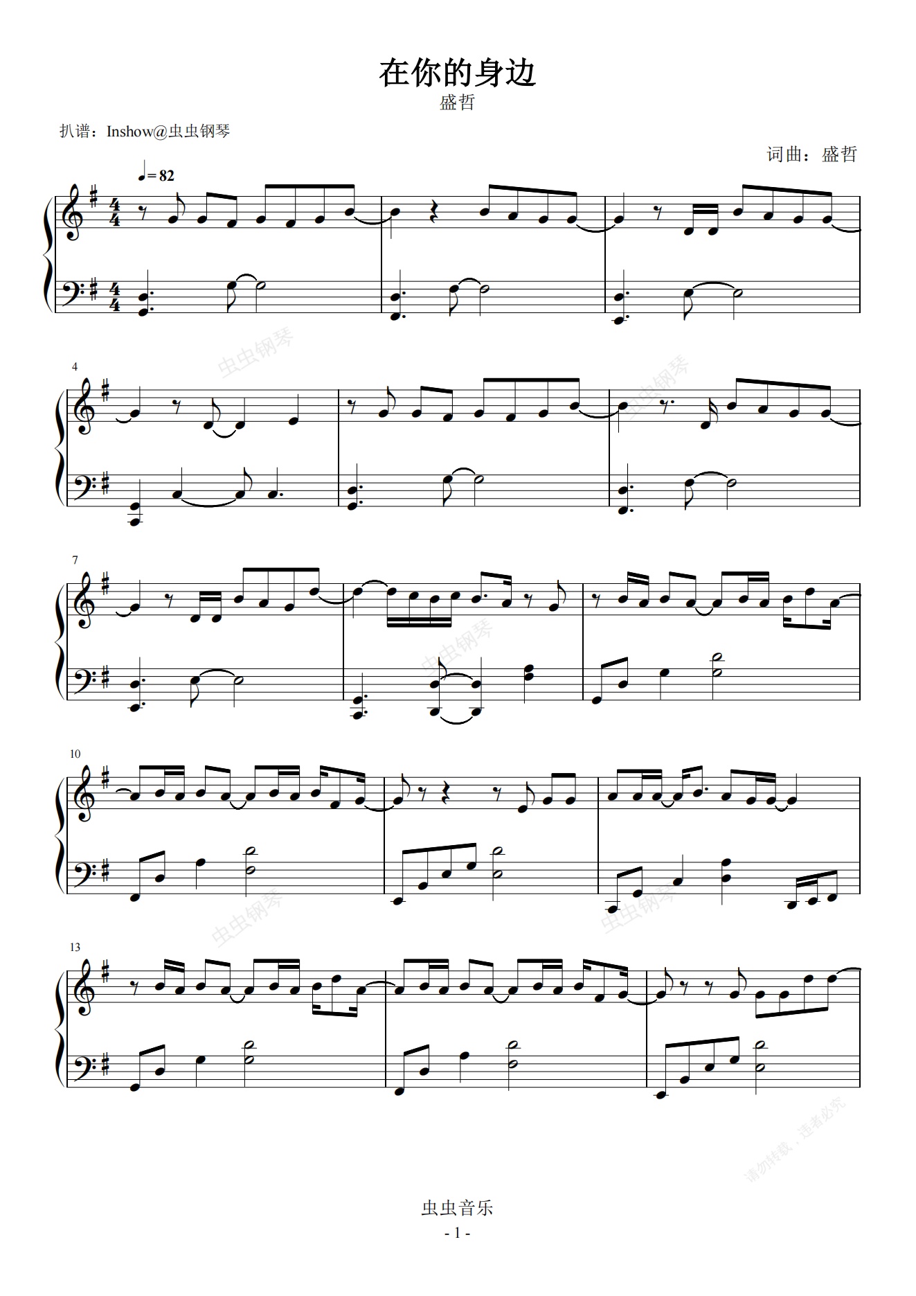 钢琴谱:在你的身边【独奏】- 盛哲 -
