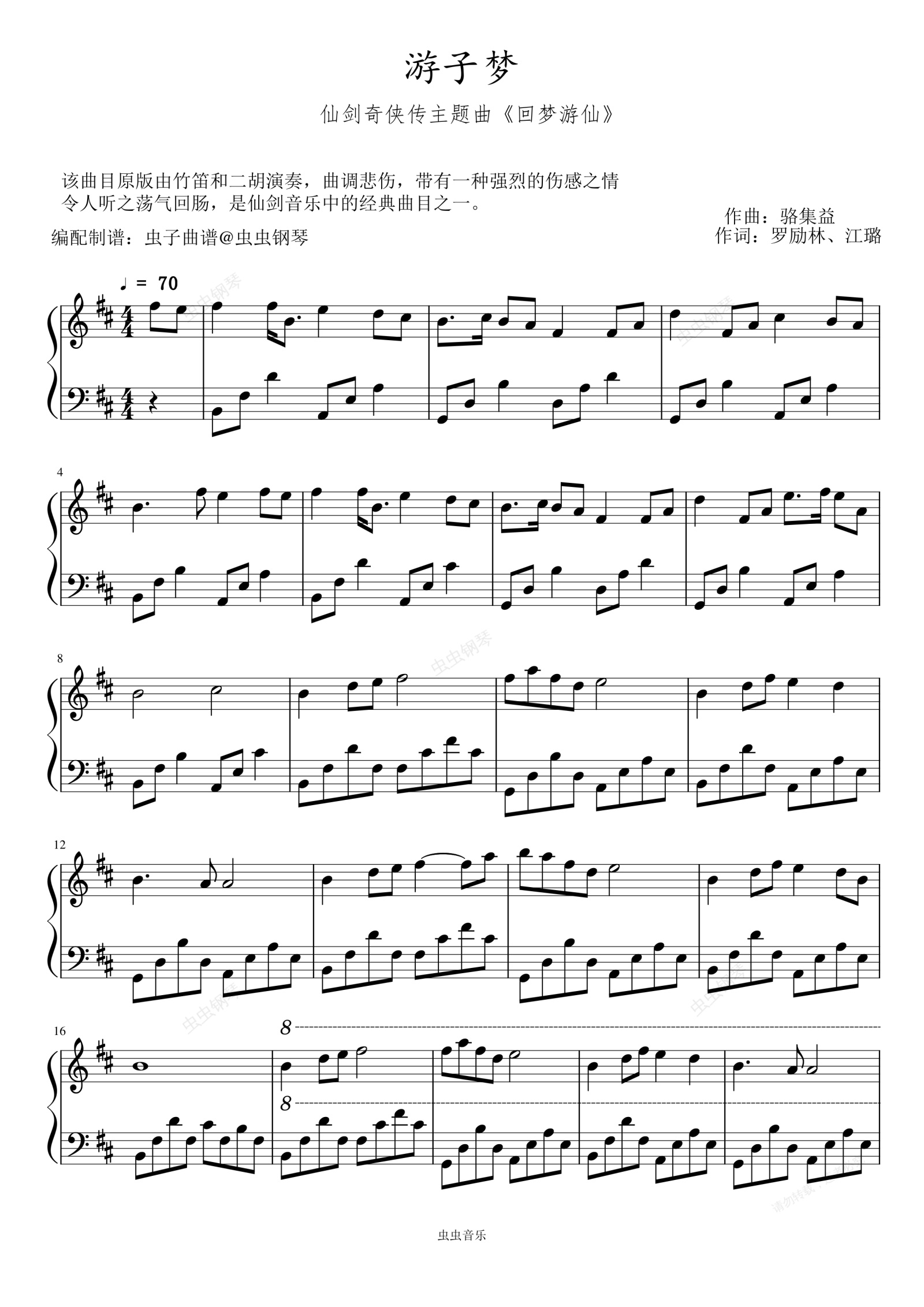 钢琴谱:游子梦_D大调 (仙剑奇侠传主题曲《回梦游仙》) 原调编配