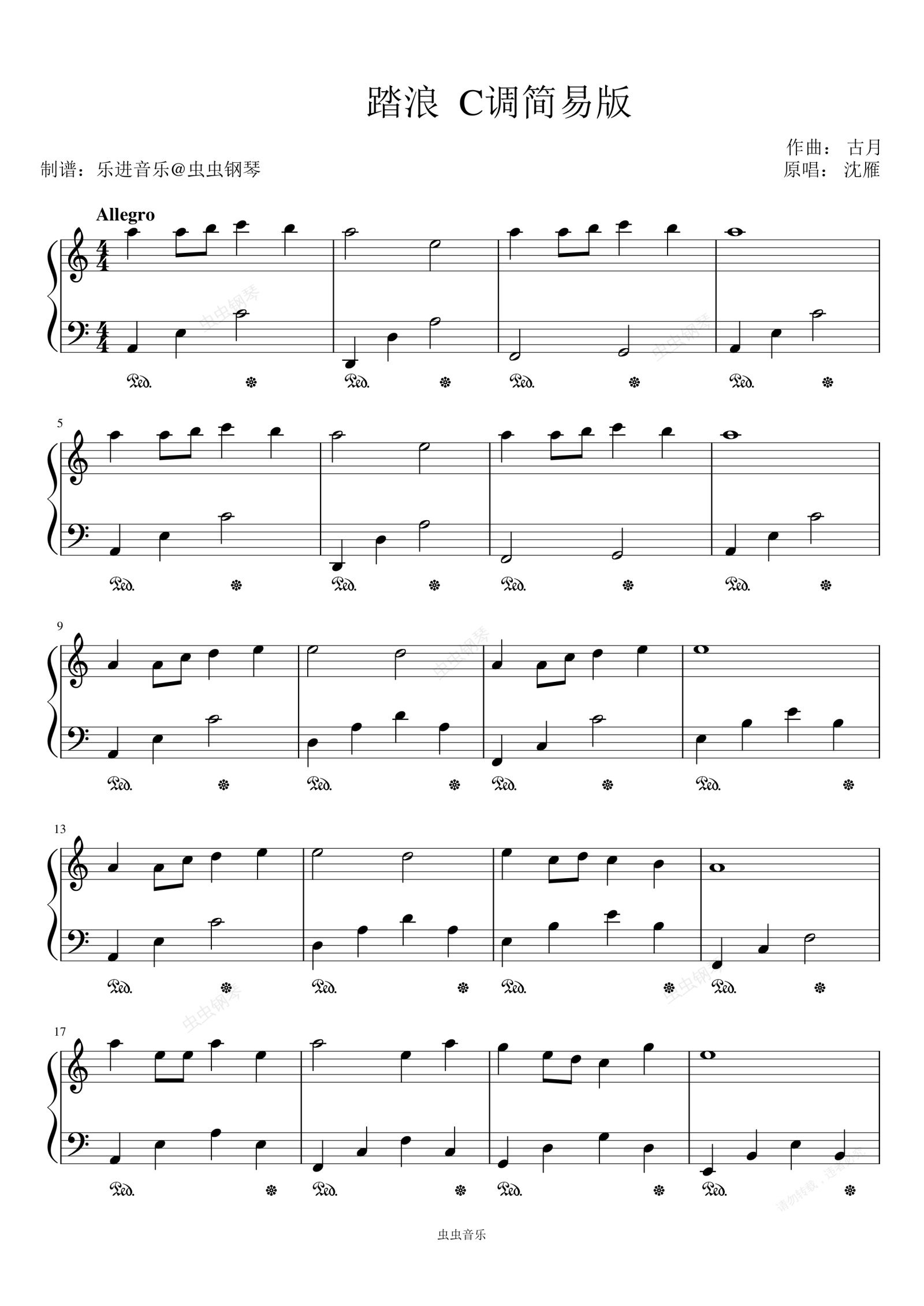 钢琴谱:《踏浪》C调初级简易版