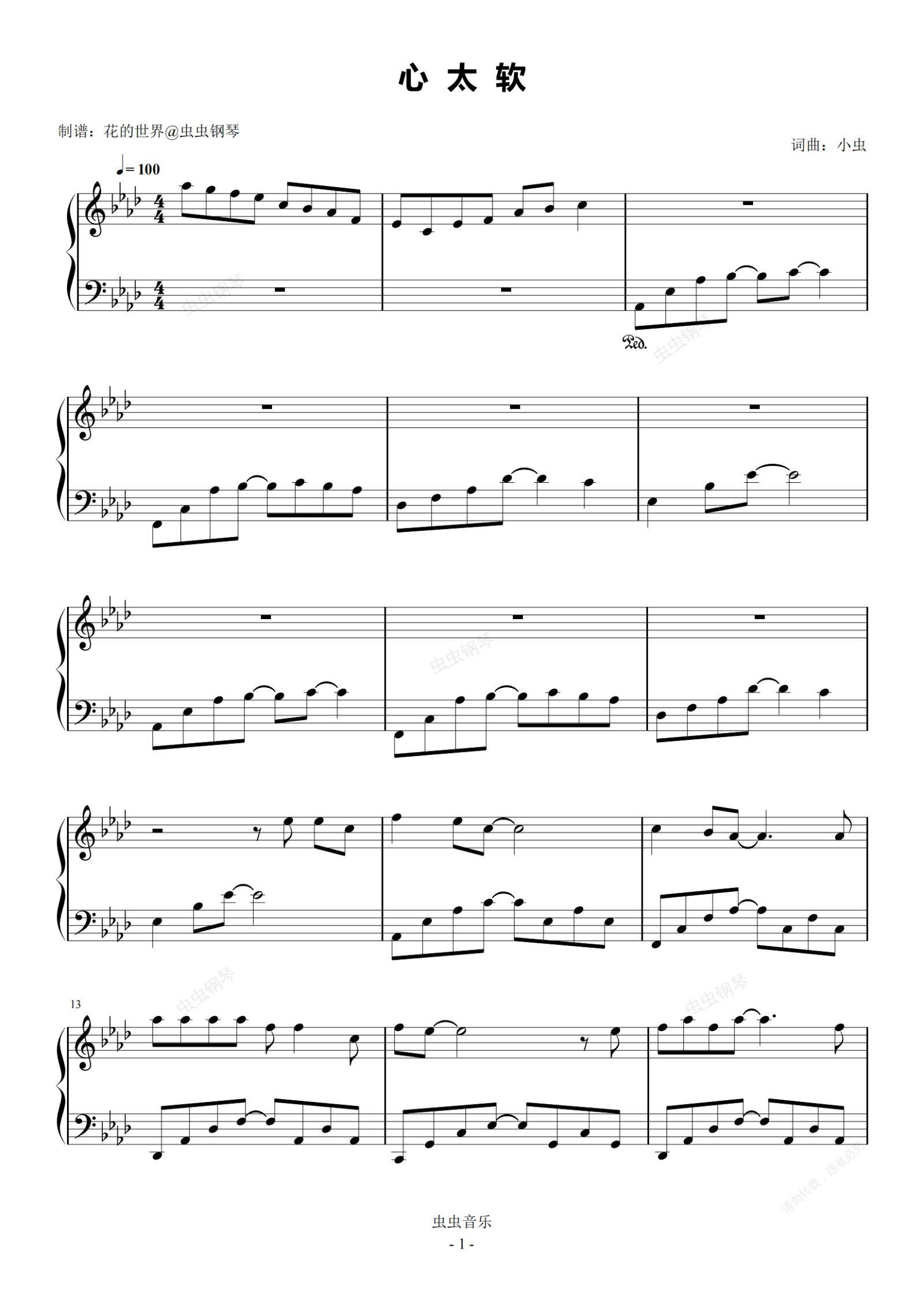 钢琴谱:心太软 原调简易版 任贤齐 流行经典