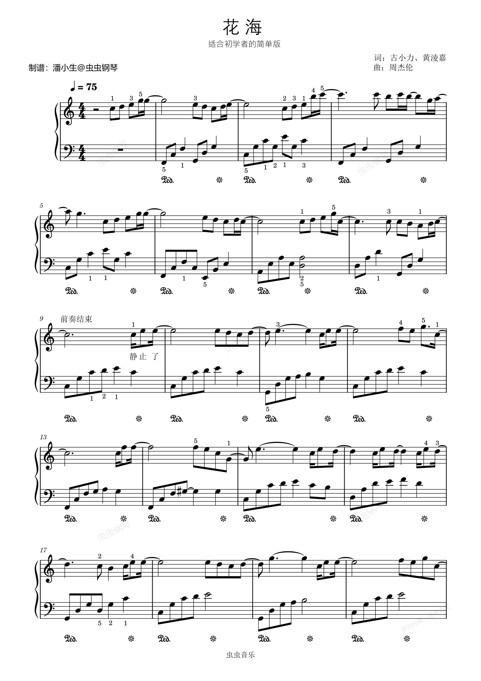 钢琴谱:花海,初学者简单版,带指法C大调,周杰伦,独奏谱