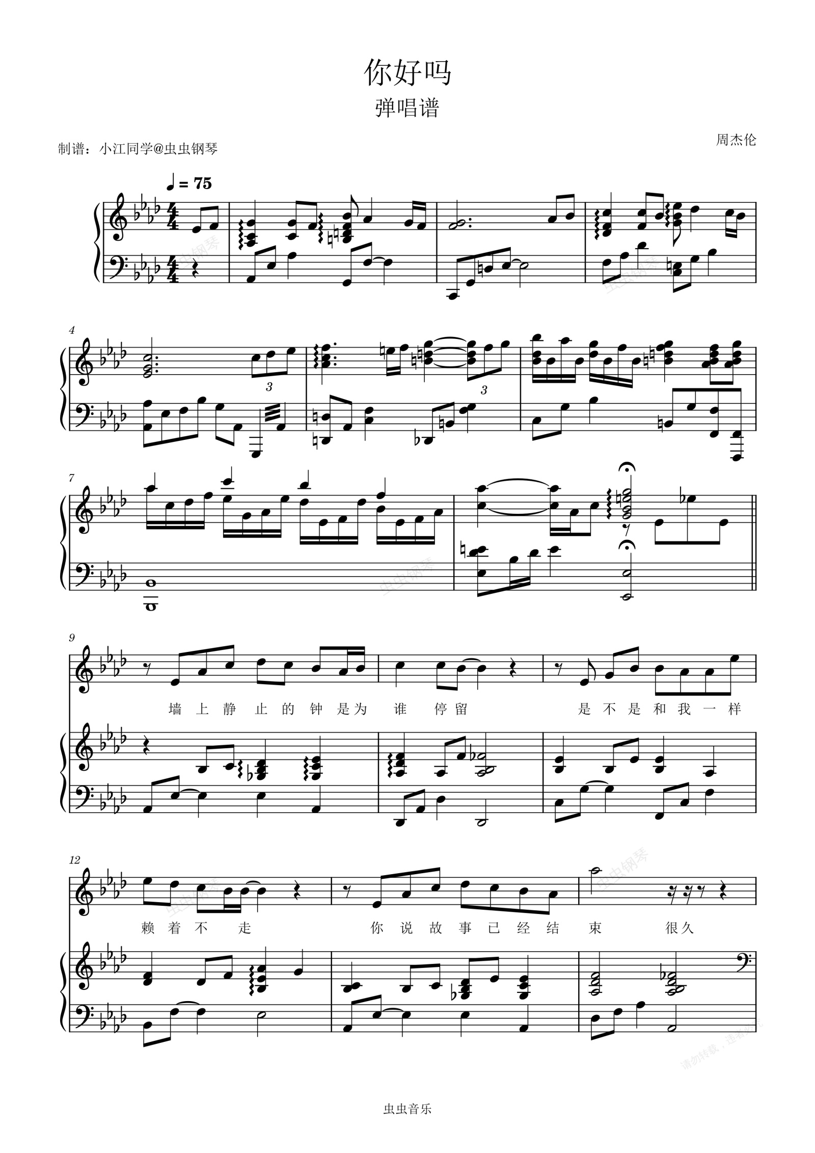 钢琴谱:你好吗 弹唱谱 周杰伦