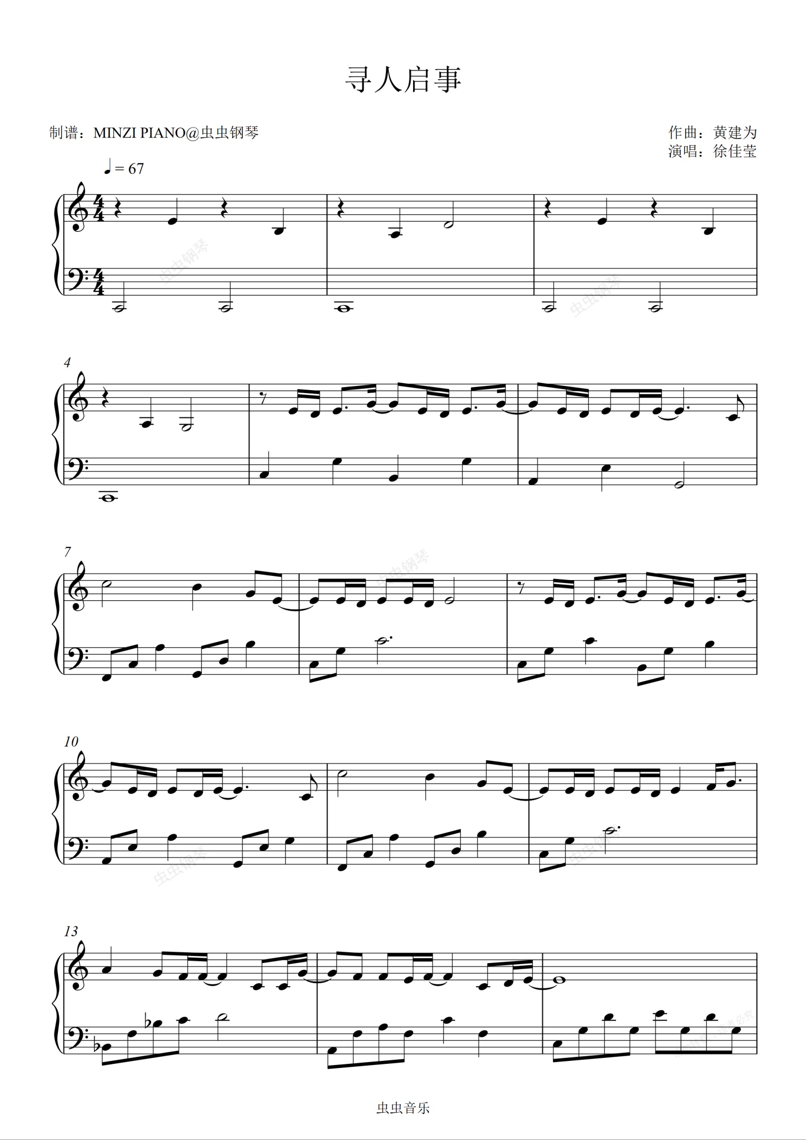钢琴谱:寻人启事-徐佳莹 C调