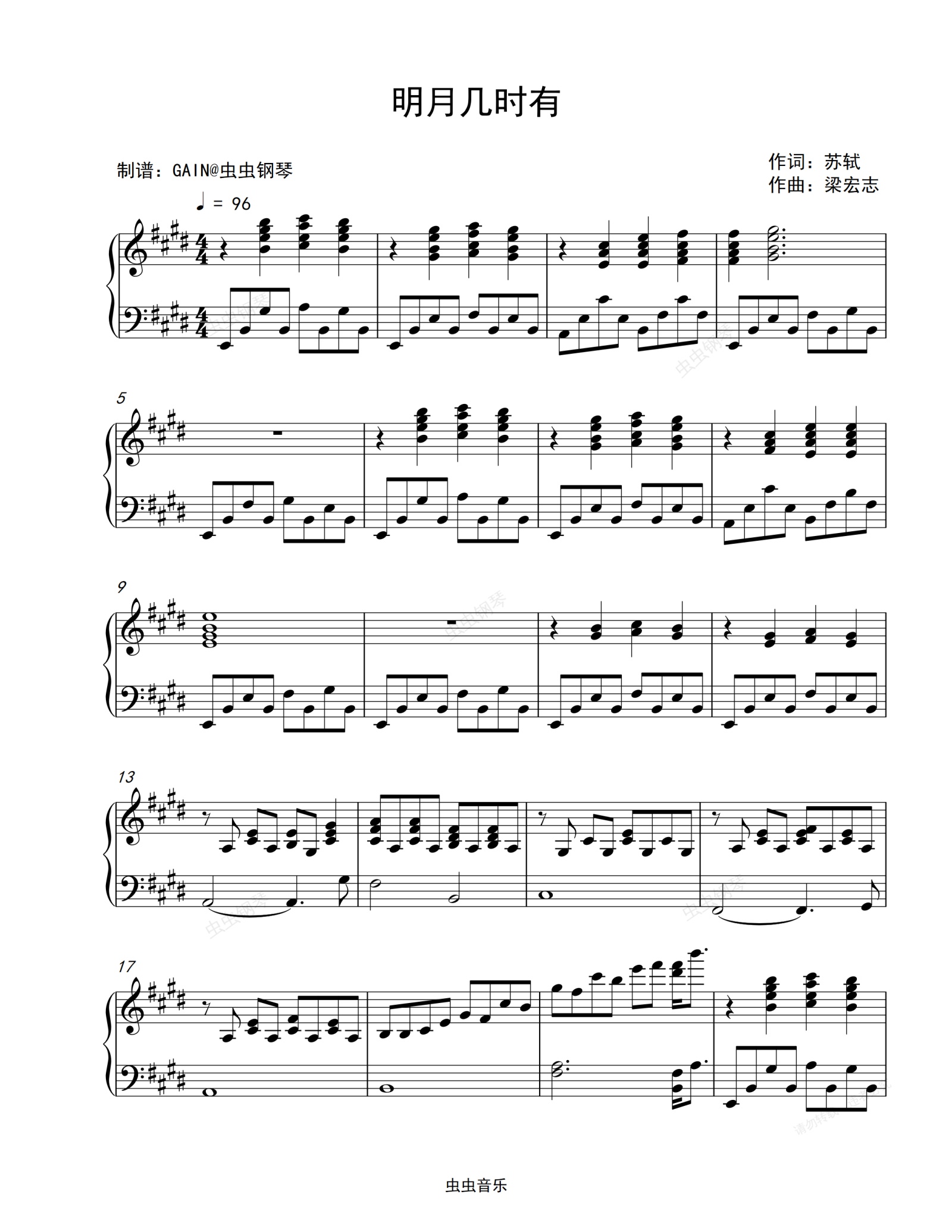 钢琴谱:明月几时有-王菲