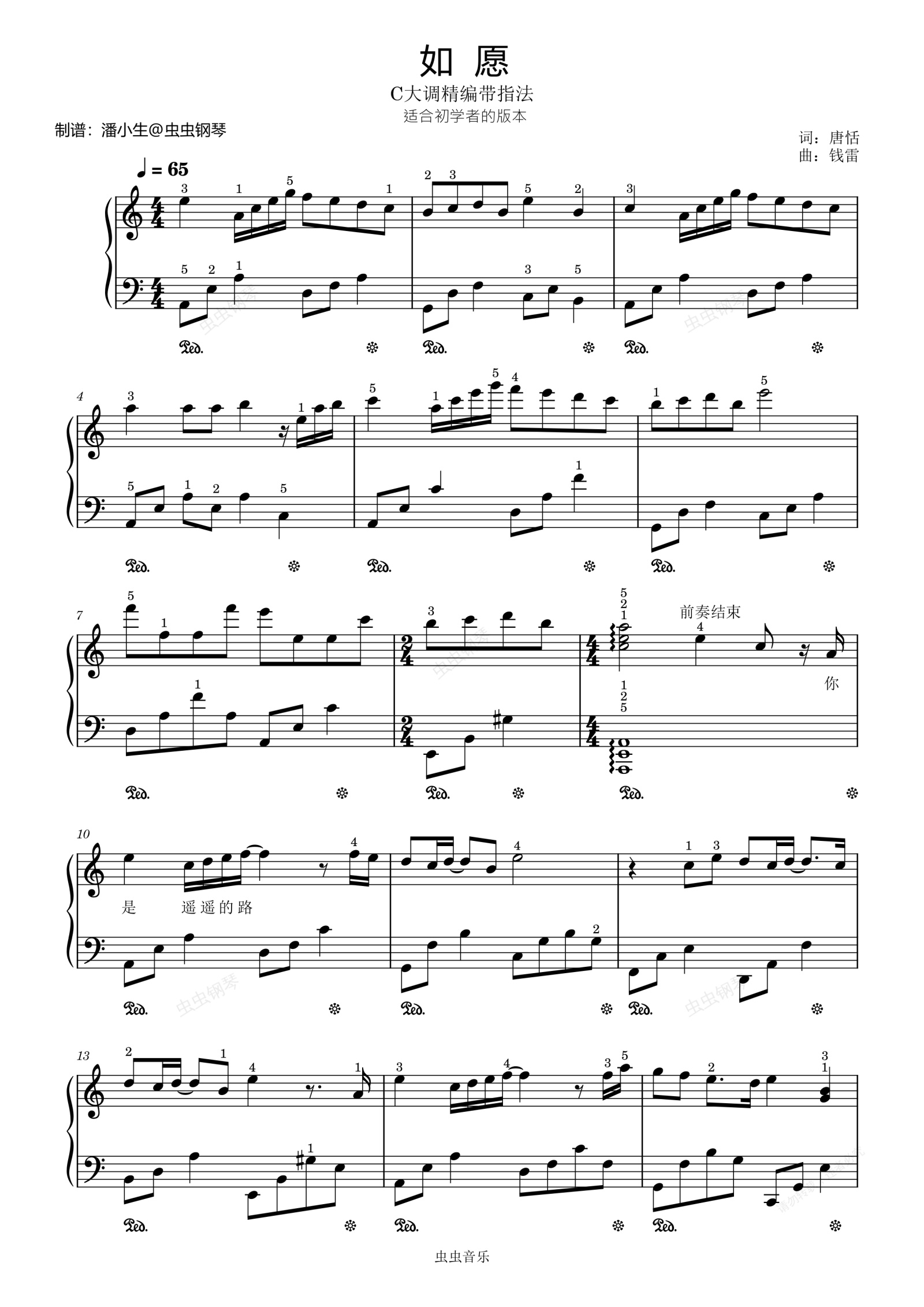 钢琴谱:《如愿》王菲,精编C大调初学者版,带指法