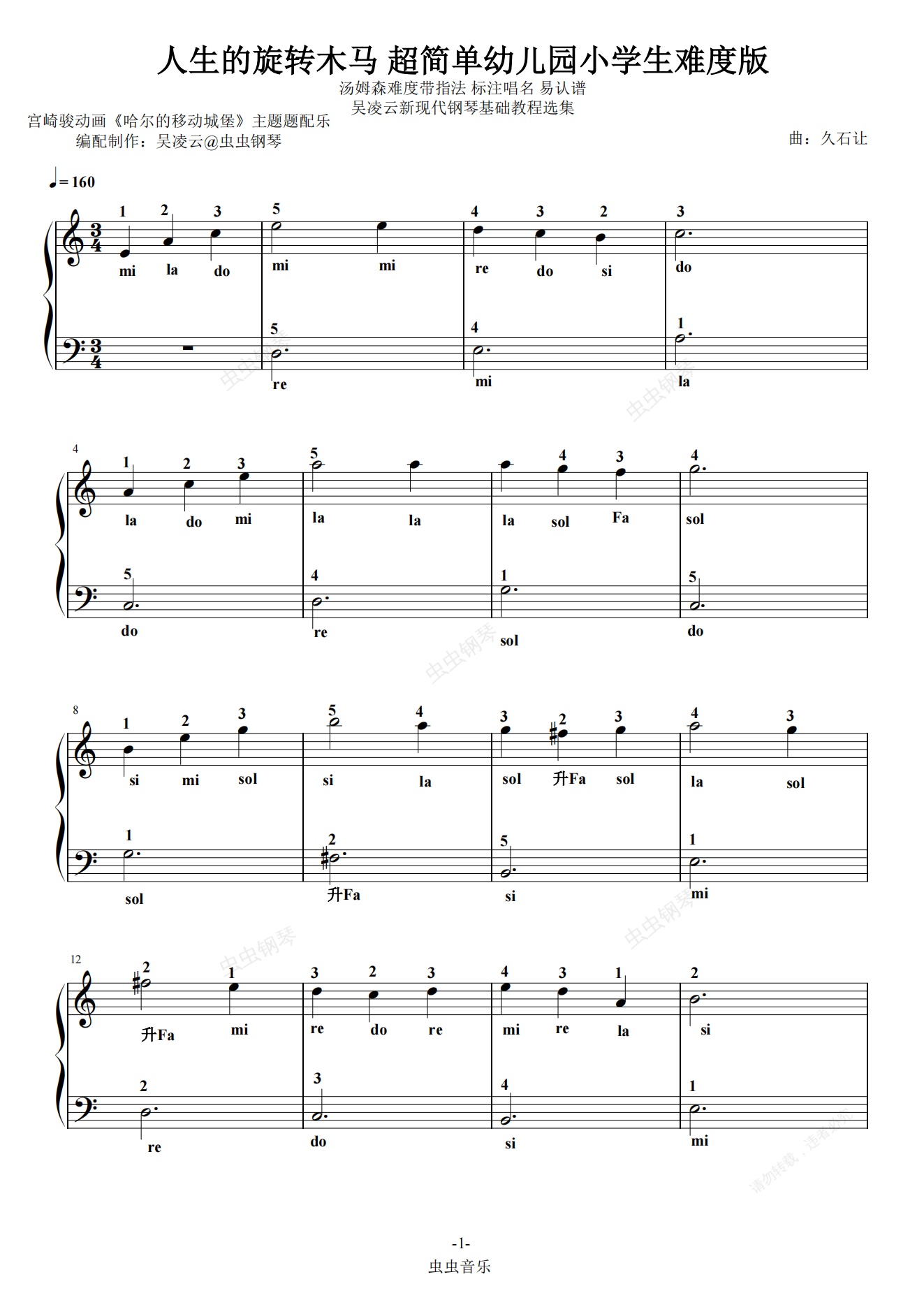 钢琴谱:人生的旋转木马 超简单幼儿汤姆森难度版 指法+唱名 久石让 吴凌云新现代钢琴基础教程选集