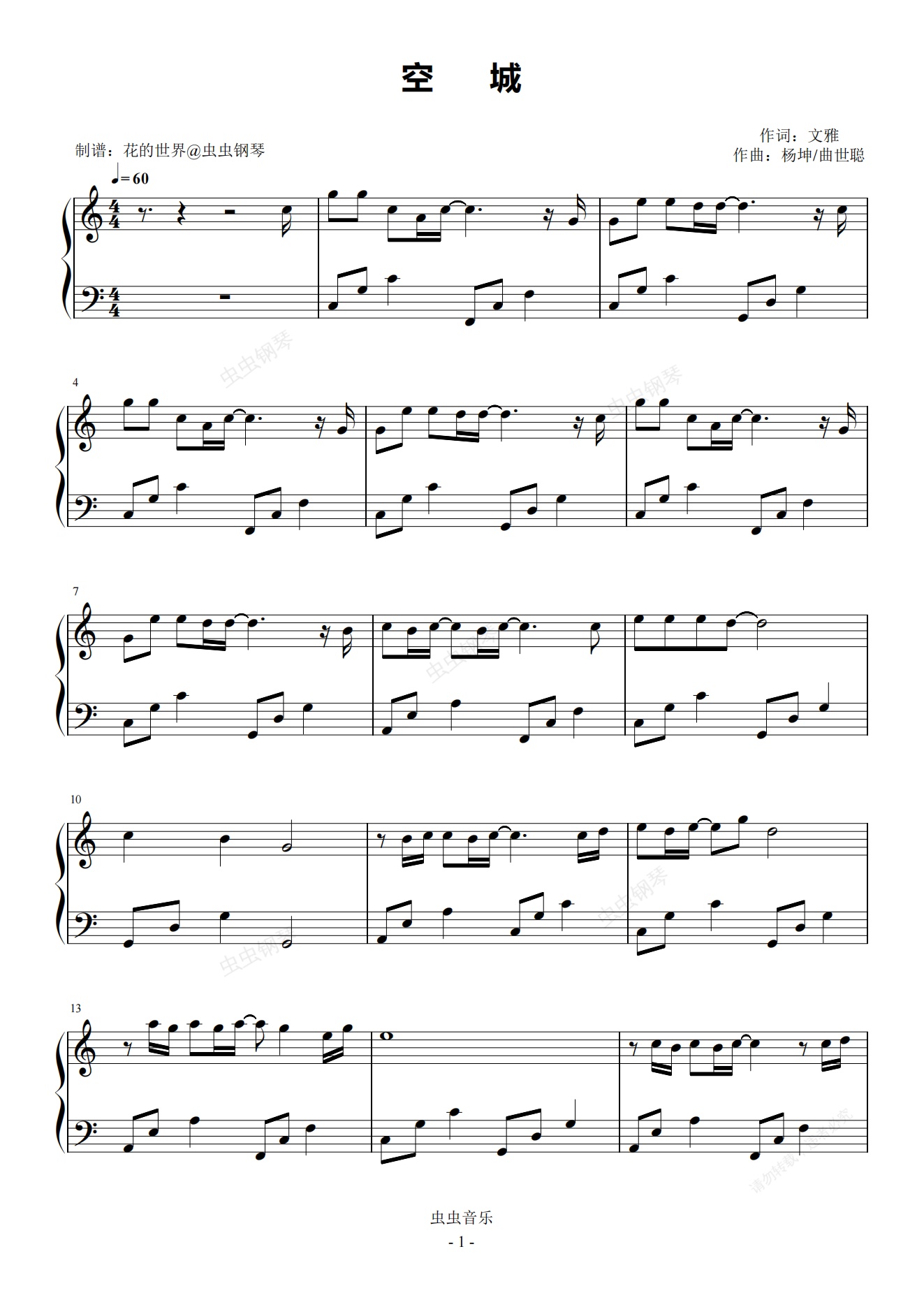 钢琴谱:空城 C调简易版本 杨坤