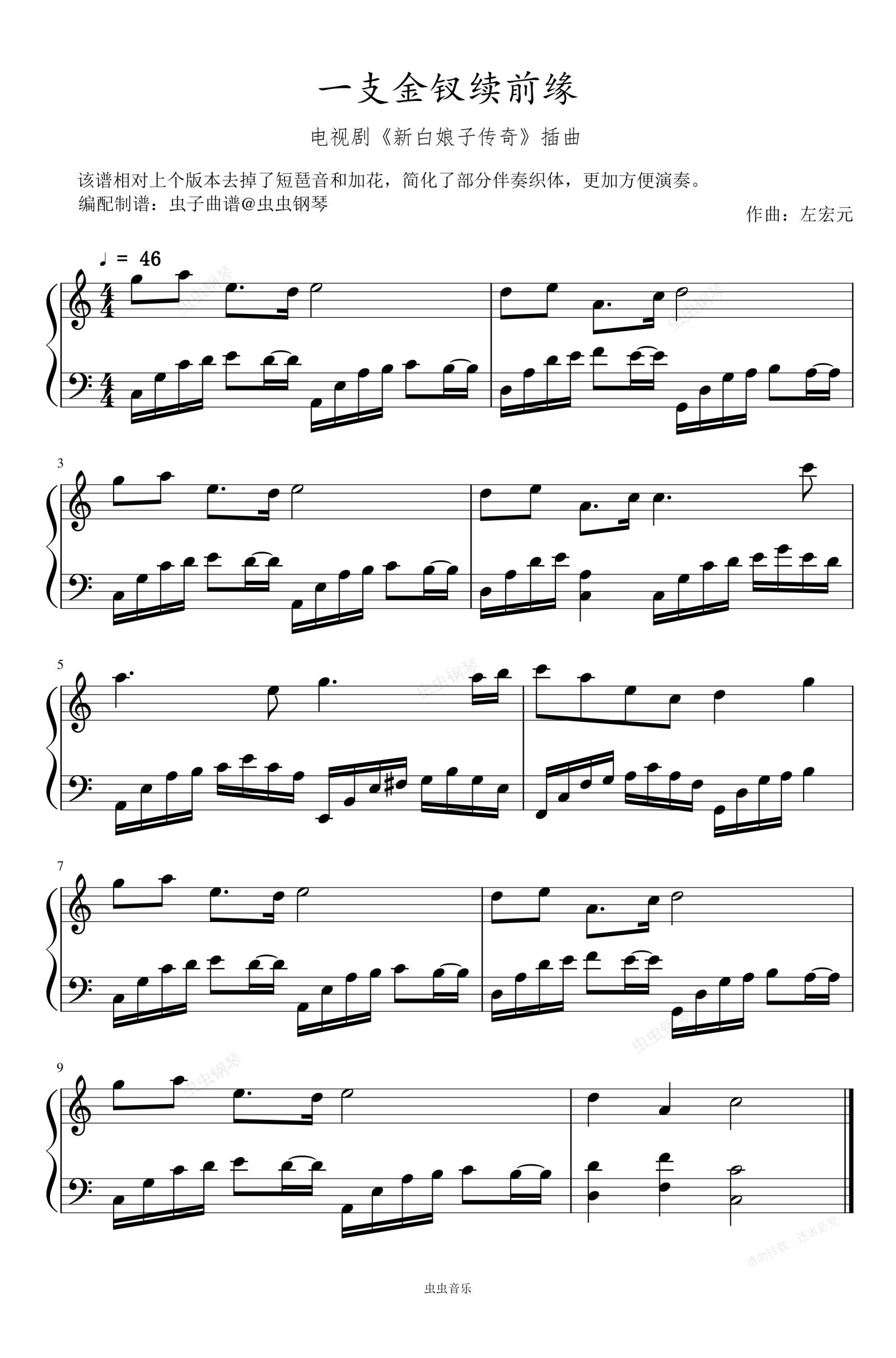 钢琴谱:一支金钗续前缘_C(新白娘子传奇插曲_选调简单抒情)原声还原