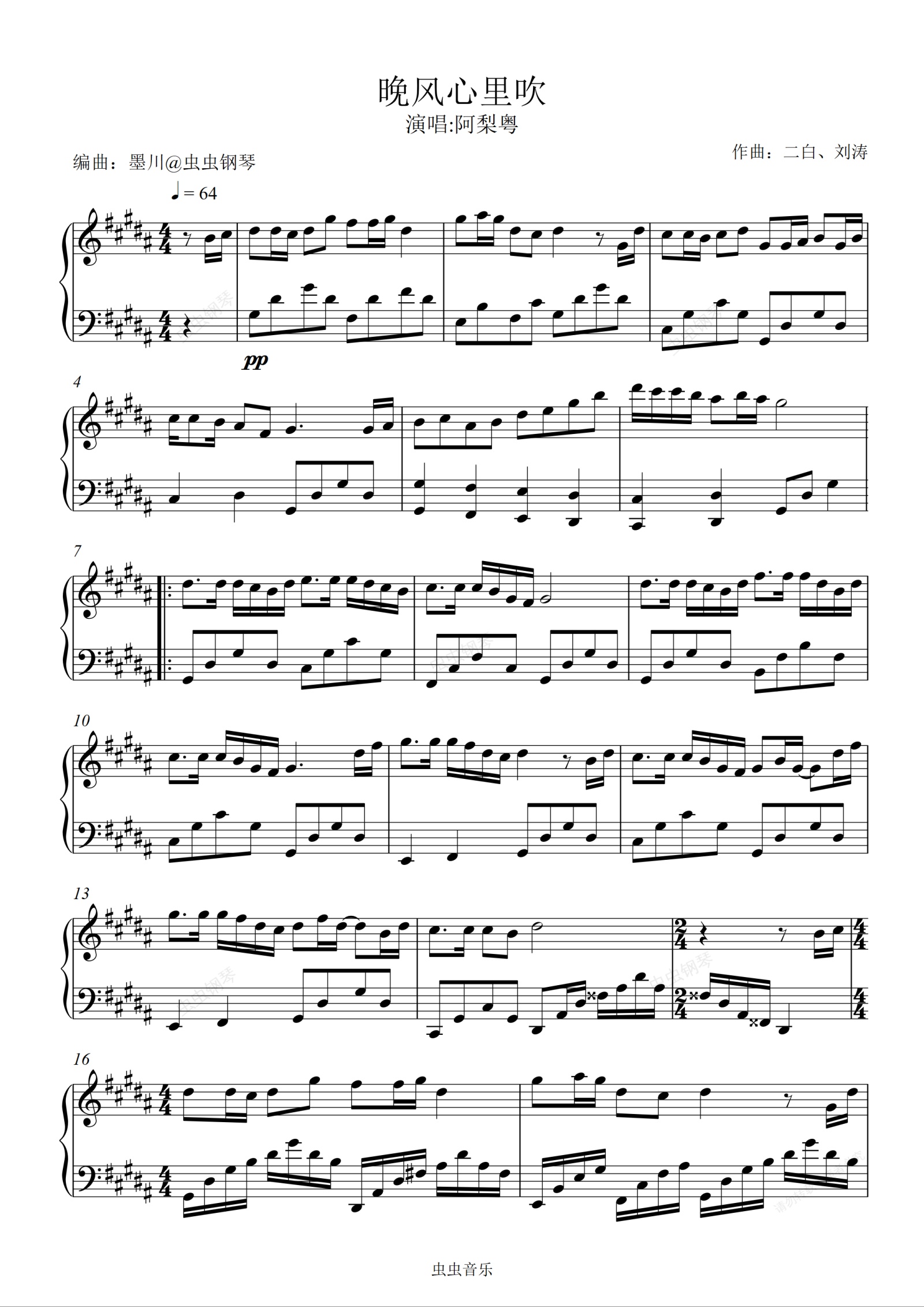 钢琴谱:晚风心里吹—阿梨粤—原调弹奏