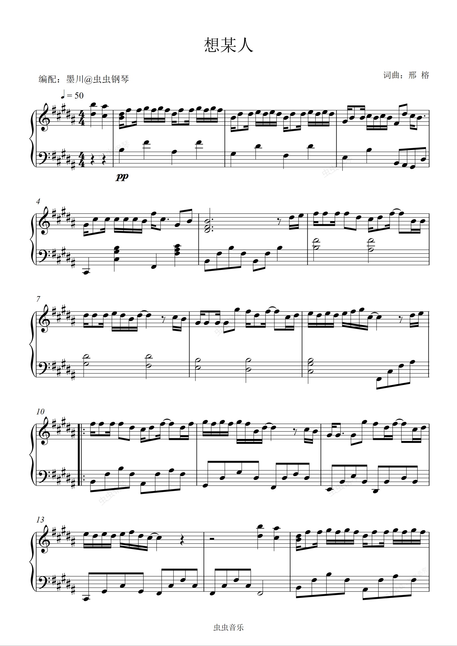 钢琴谱:想某人—桂羽七—原调B调简易演奏