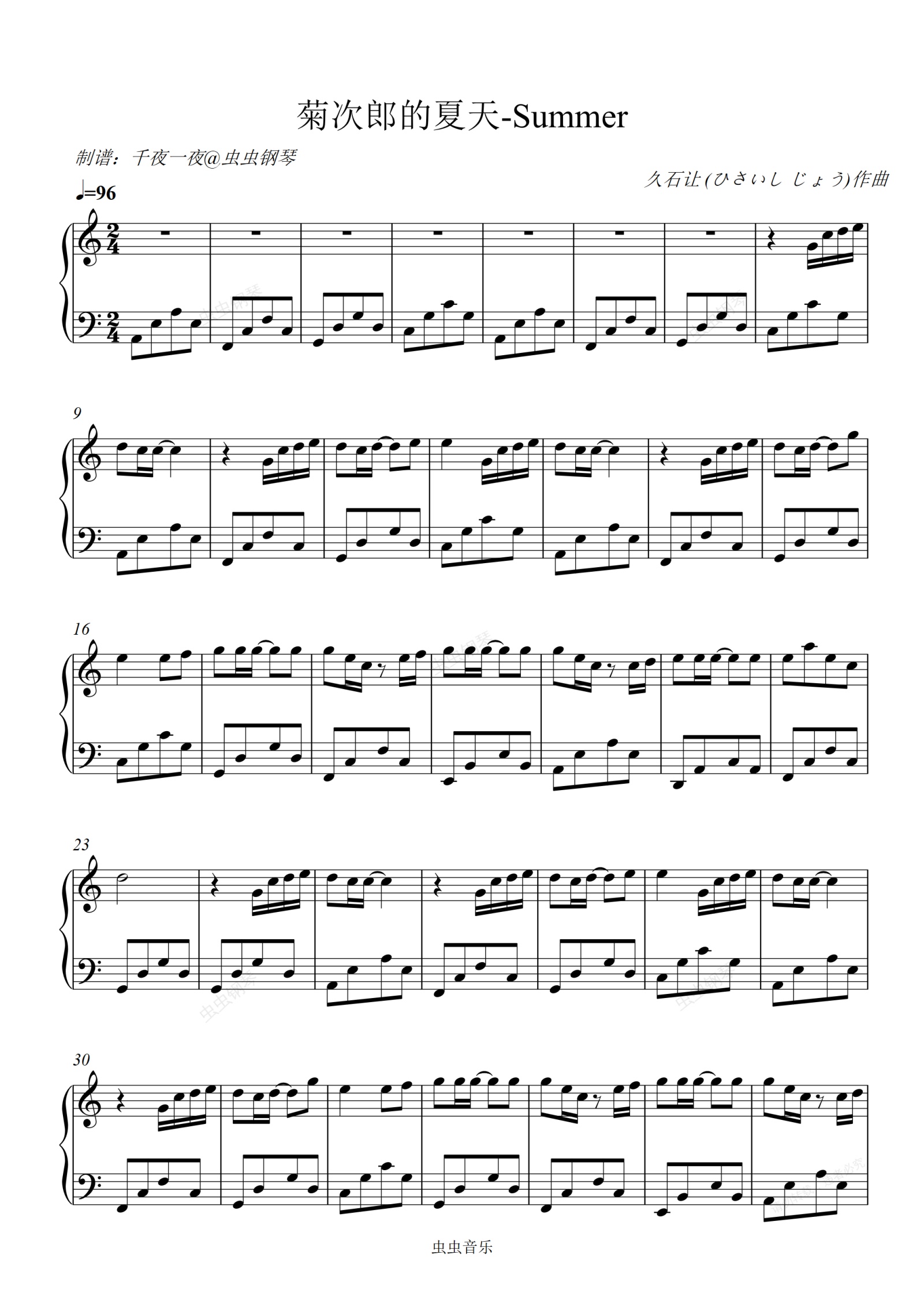 钢琴谱:【钢琴】久石让《菊次郎的夏天》Joe Hisaishi - Summer C调简单版