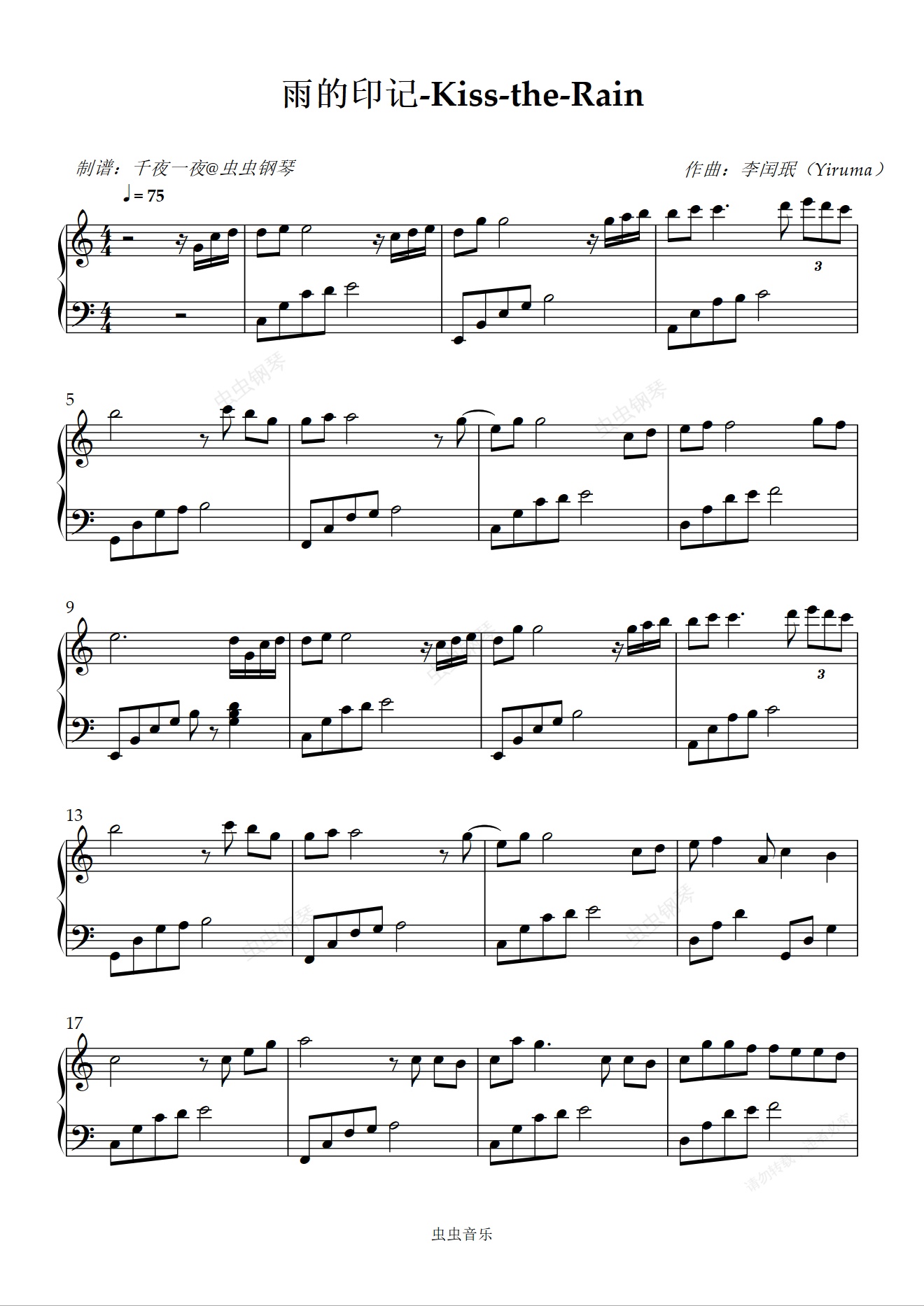 钢琴谱:超好听的纯音乐 Kiss the rain雨的印记 一首公认的好听的钢琴曲 简单版