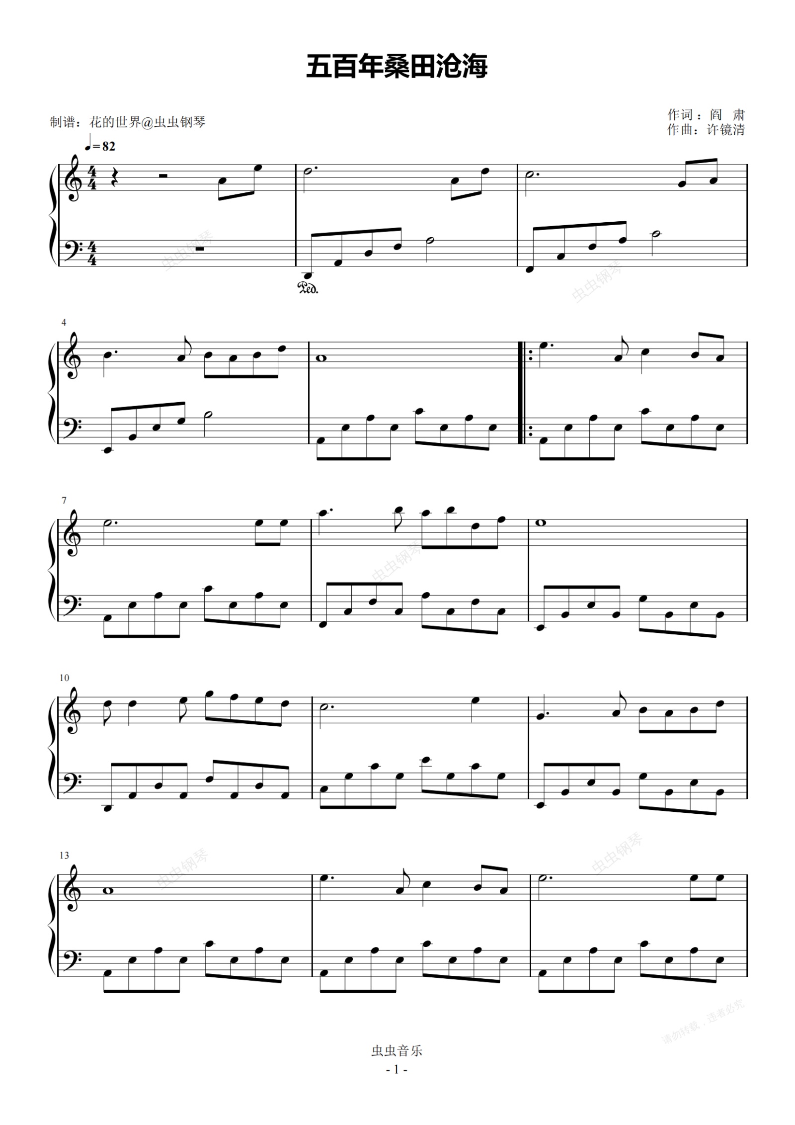 钢琴谱:五百年沧海桑田 C调简易版 郁钧剑