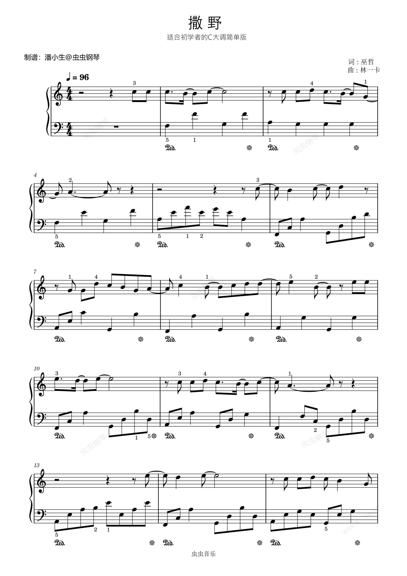 钢琴谱:《撒野》凯瑟喵,精编C大调初学者版,带指法踏板